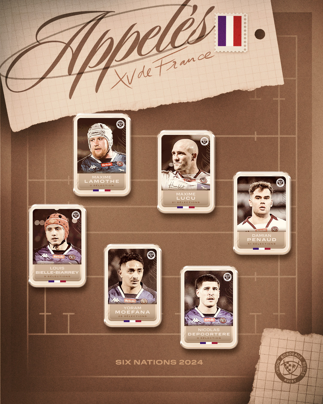 Le staff du XV de France a dévoilé la liste des 34 joueurs retenus pour préparer le match face au Pays de Galles. Parmi eux, nous retrouvons 6 de nos Bordeaux & Blanc !