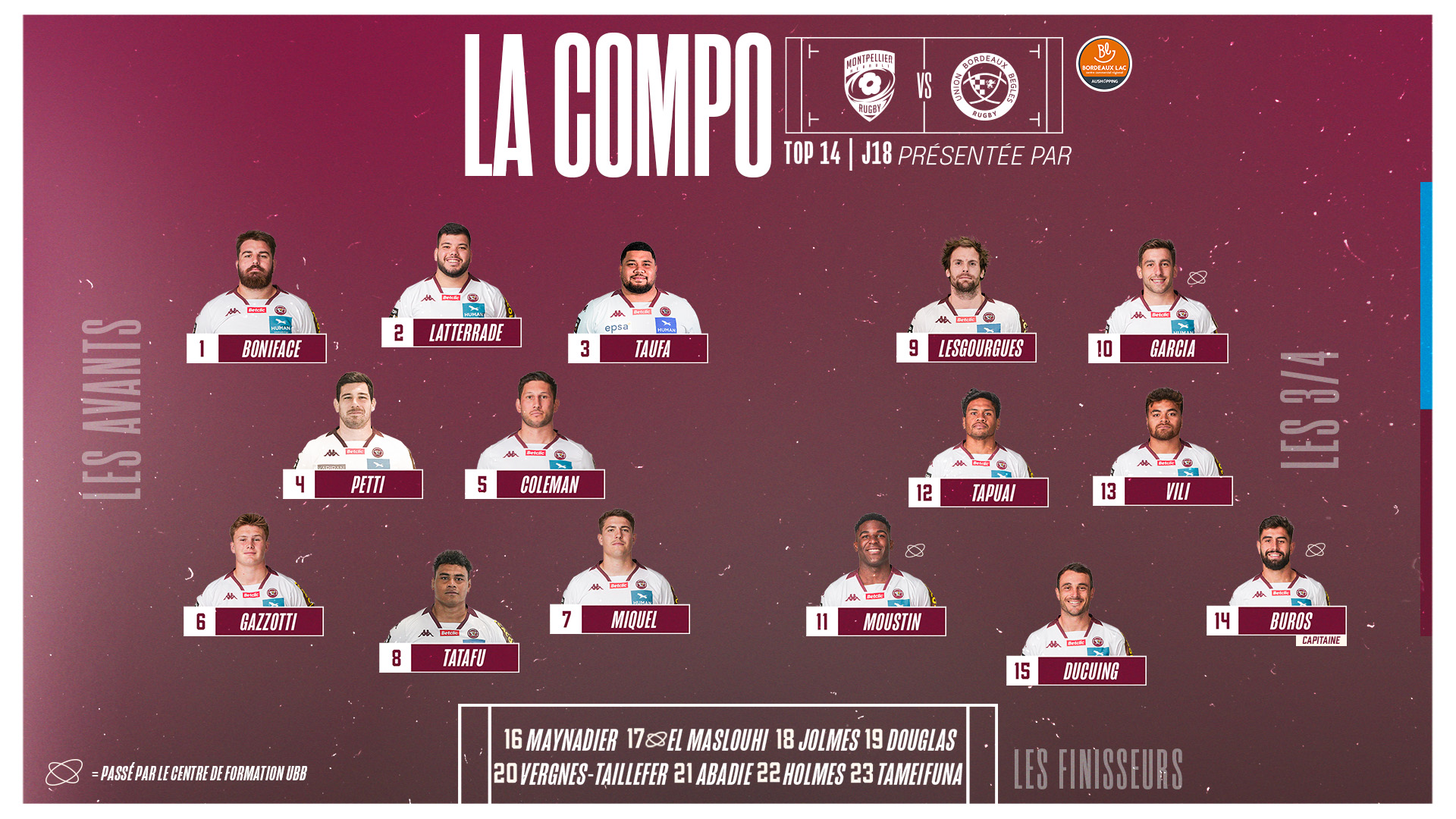 Gros turnover à l'avant avec pas moins de 6 changements. La première ligne est complètement remaniée et c'est Ugo Boniface, Romain Latterrade ainsi que Toma Taufa qui débuteront le match face aux Montpelliérains. Moins de mouvement dans la ligne arrière avec une nouvelle paire de centres. Si Nicolas Depoortere est capé pour la première fois en Équipe de France, c'est le retour de Ben Tapuai, associé à Tani Vili.