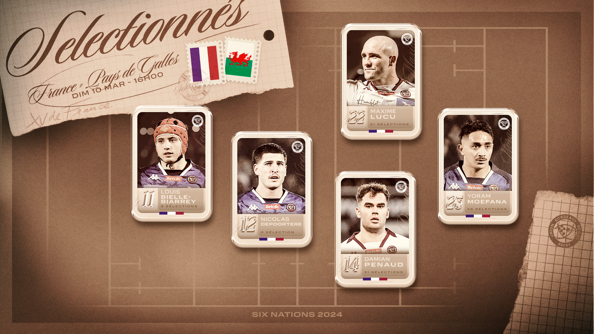 Quatrième et avant-dernière rencontre de ce Tournoi des 6 Nations 2024 pour nos Bleus qui affronteront le Pays de Galles, ce dimanche 10 mars à 16h, au Principality Stadium de Cardiff. Cinq joueurs de l'UBB sont présents sur la feuille de match et l'un d'entre eux célèbrera sa première cape...