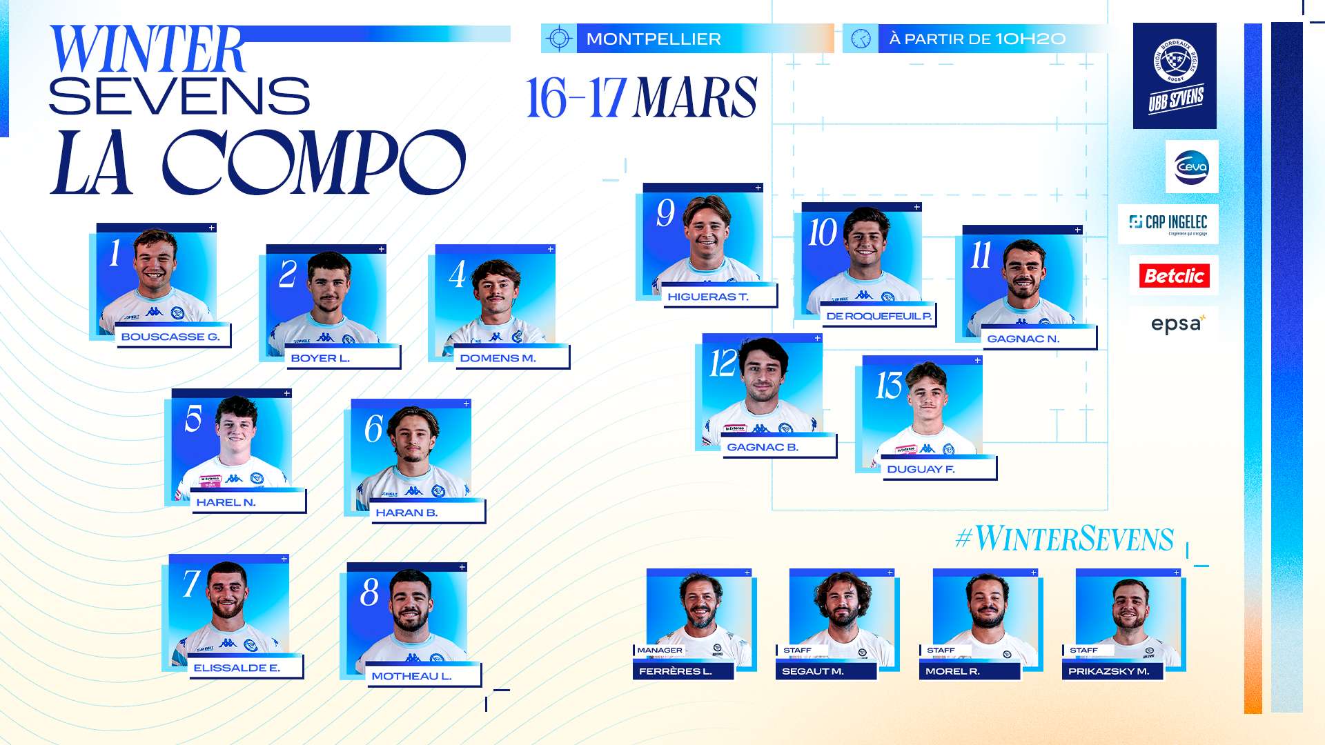 5 joueurs sur les 13 présents l'an dernier faisaient partis de cette nouvelle édition 2024. 3 nouveaux joueurs faisaient également leurs débuts avec l'UBB Sevens.