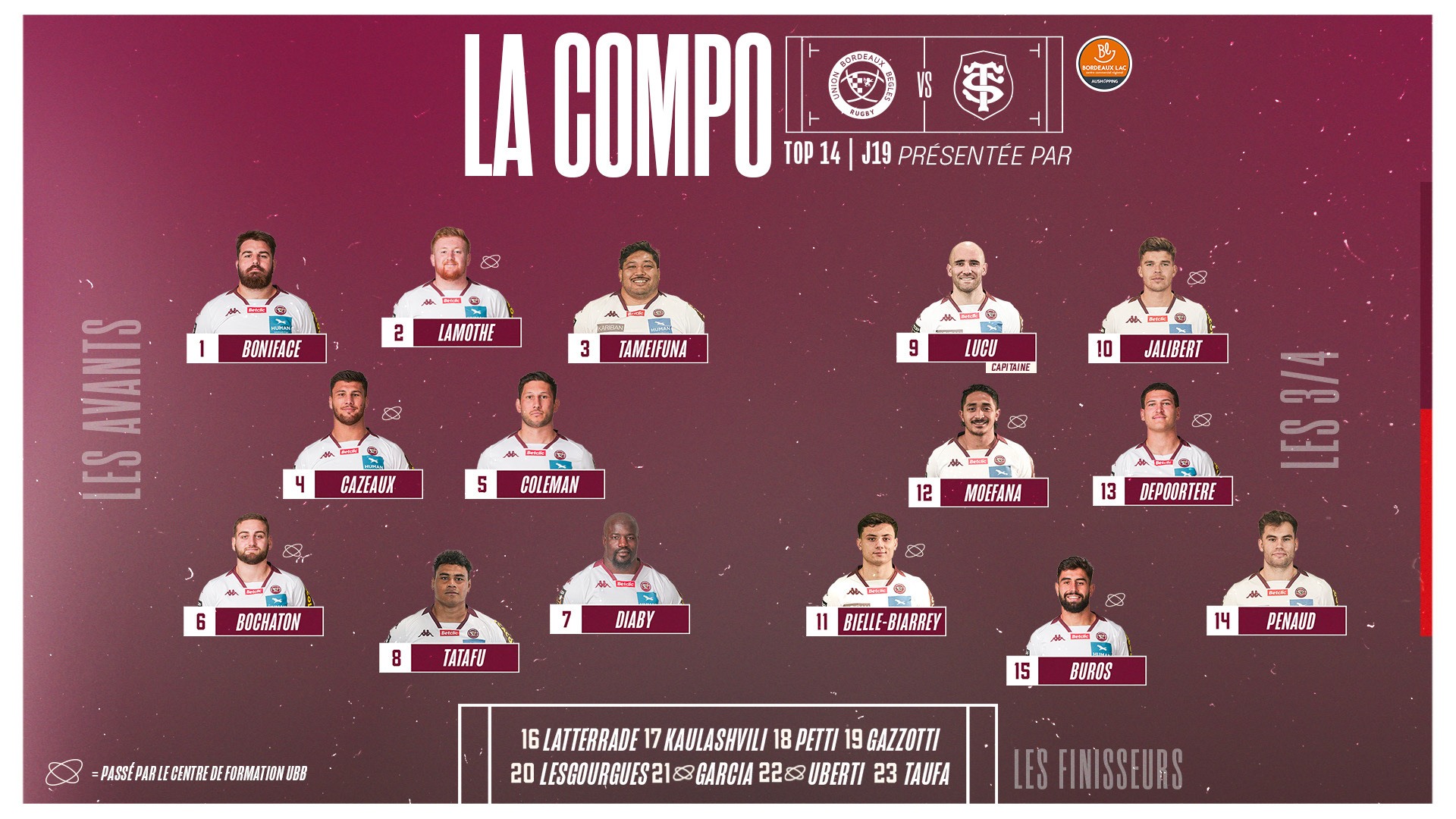 Demain soir, notre équipe à rendez-vous au Matmut Atlantique pour le choc à domicile face au Stade Toulousain ! Cette 19e journée de TOP 14 signe la fin des doublons. Découvrez la composition d'équipe mise en place par Yannick Bru et son staff sportif.
