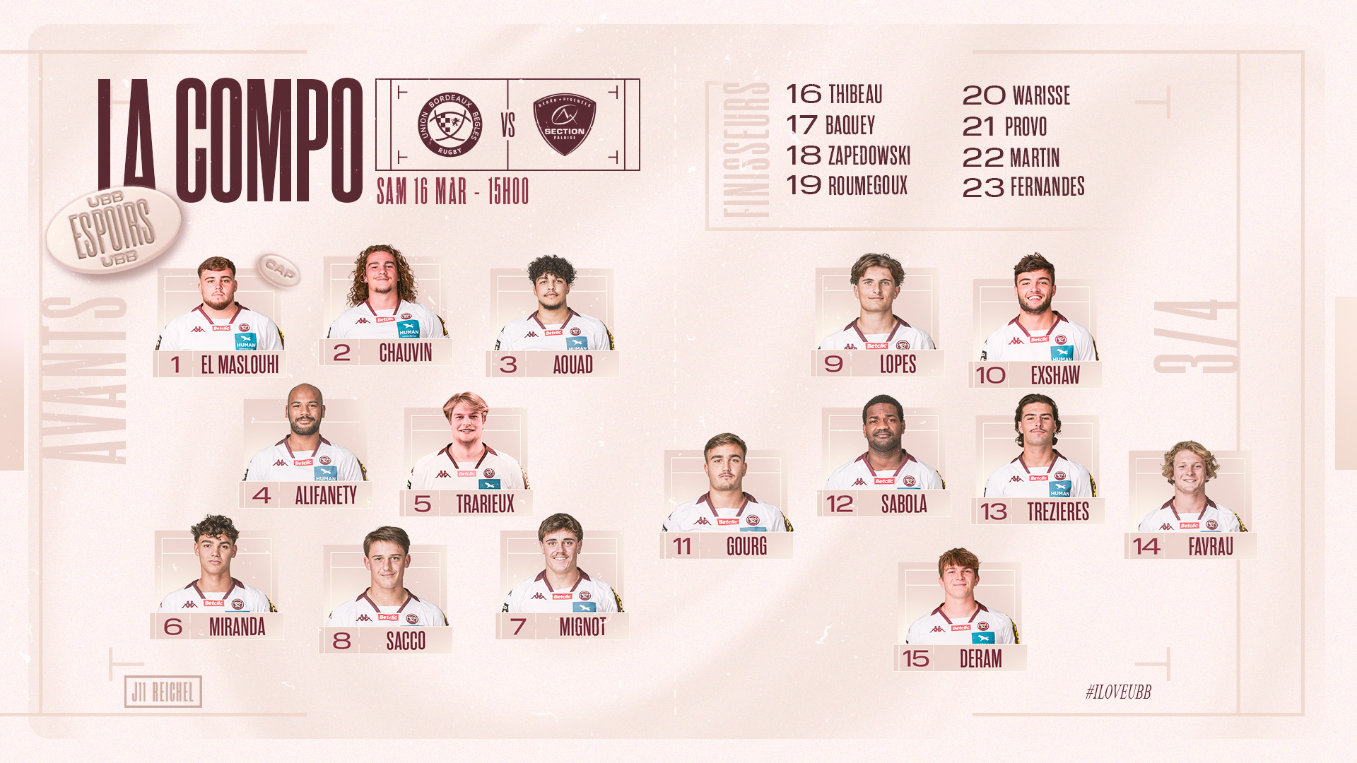 Frédéric Garcia et son staff sportif ont dévoilé les 23 joueurs qui affronteront la Section Paloise samedi 23 mars à 15h au Stade Moga - CEVA Campus.