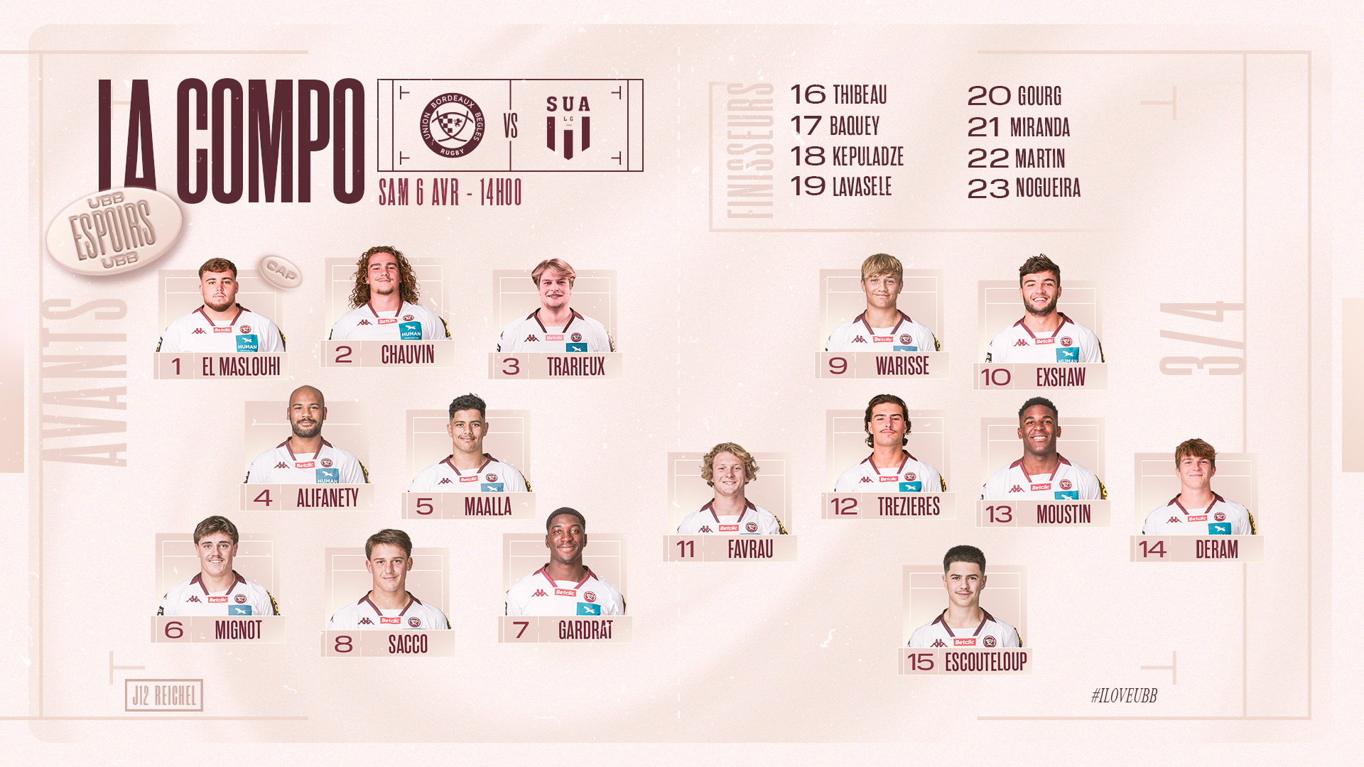 7 changements dans la composition d'équipe de ce week-end et des retours de blessure importants pour notre équipe ! Avec notamment Amine Maalla en seconde ligne ou encore Romain Gardrat en troisième ligne. Matéo Lavasele sera également parmi les finisseurs.