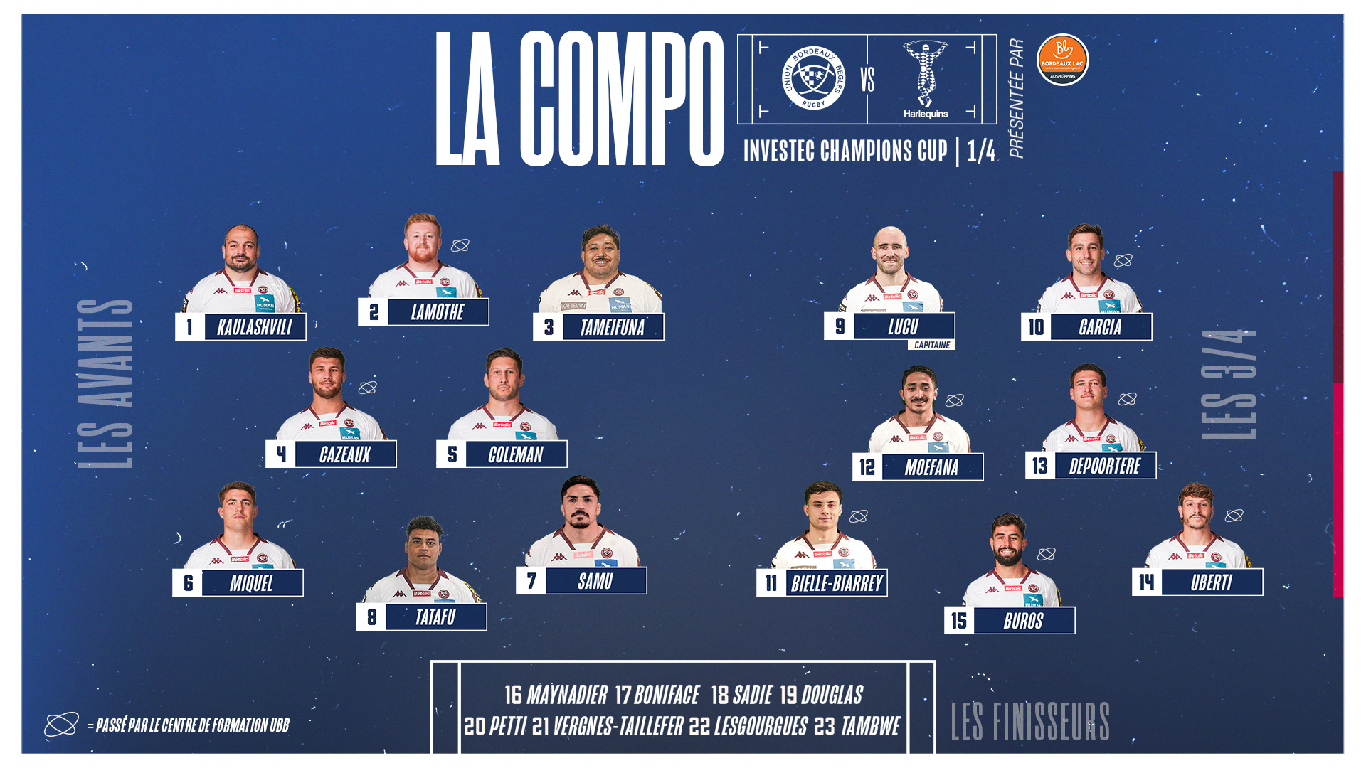 Découvrez la composition de l'équipe des 23 girondins qui affronteront les Harlequins ce samedi 13 avril à 16h sur la pelouse de Chaban en quart de finale de l'Investec Champions Cup.