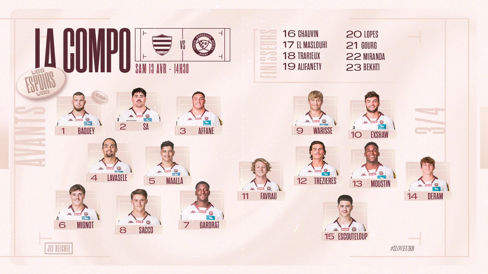 Des changements surtout à l'avant pour cette 13ème journée du Championnat Reichel. La première ligne est totalement modifiée avec Florian Baquey et Zaccharie Affane aux piliers, et surtout le premier match de Connor Sa au talon cette saison. En deuxième ligne, également, le retour de Matéo Lavasele, qui avait fait partie des finisseurs le week-end passé à domicile face au SU Agen.