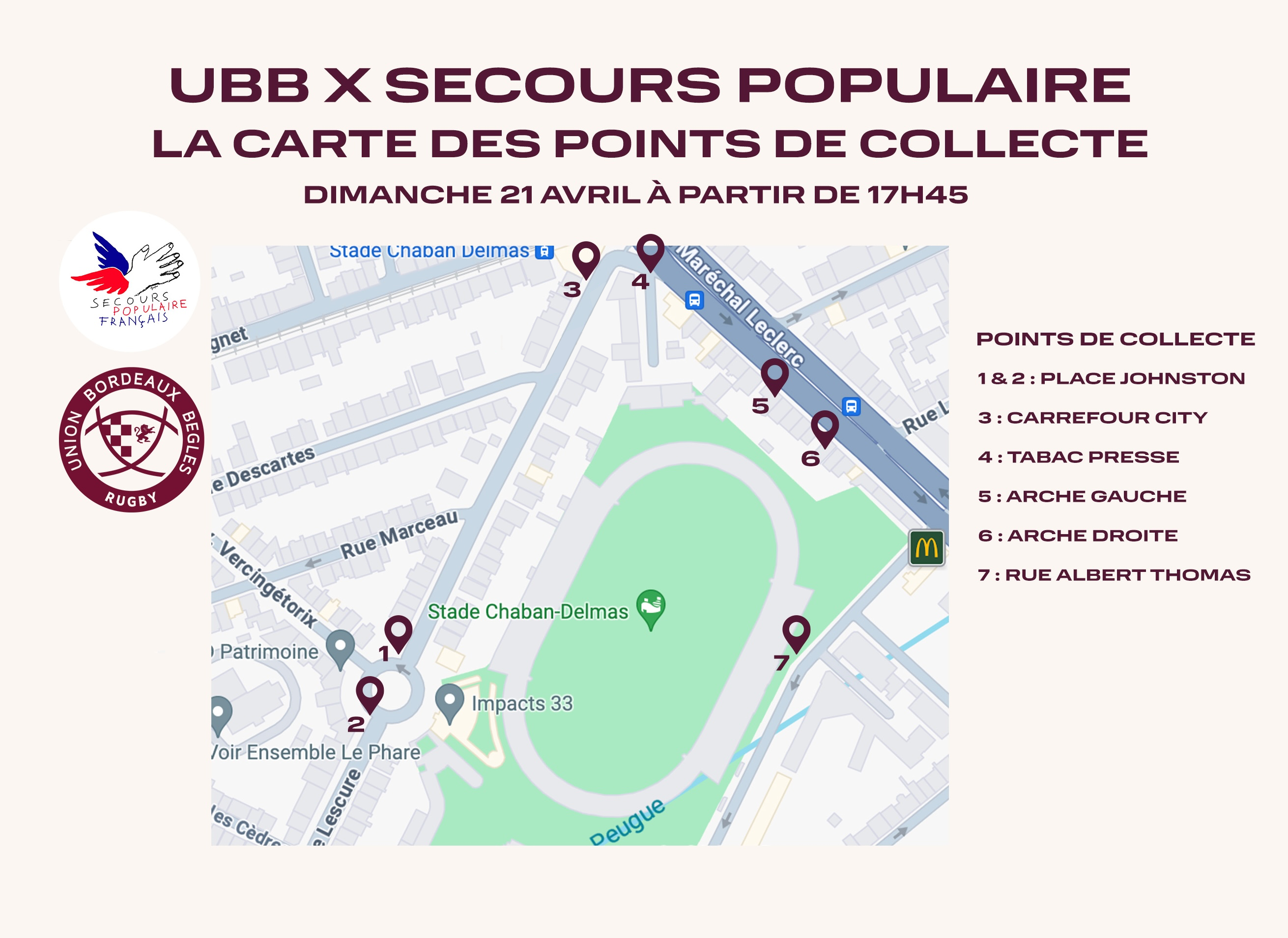 Ce dimanche l'UBB et le Secours Populaire s'associent et organisent une grande collecte solidaire avant le choc UBB Clermont à Chaban. Rendez-vous à partir de 19h sur les différents points de collecte situés autour du stade !