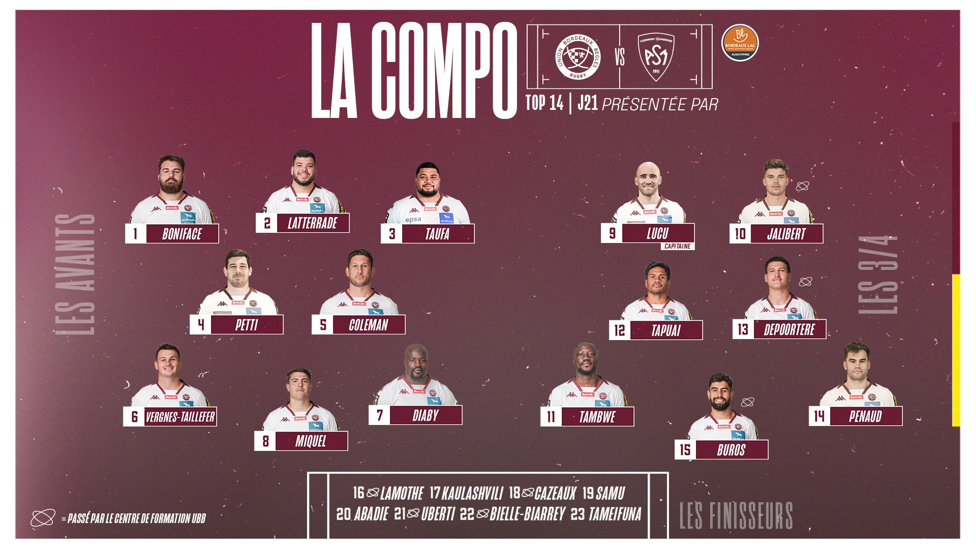 De nombreux changements ont été effectués par Yannick Bru et son staff sportif pour ce nouveau défi à Chaban-Delmas. La première ligne est entièrement modifiée avec Ugo Boniface, Romain Latterrade et Toma Taufa pour débuter. Guido Petti sera également titulaire en deuxième ligne, et enfin, Mahamadou Diaby fait son retour en troisième ligne. À noter le changement d'Antoine Miquel qui passe en numéro 8.