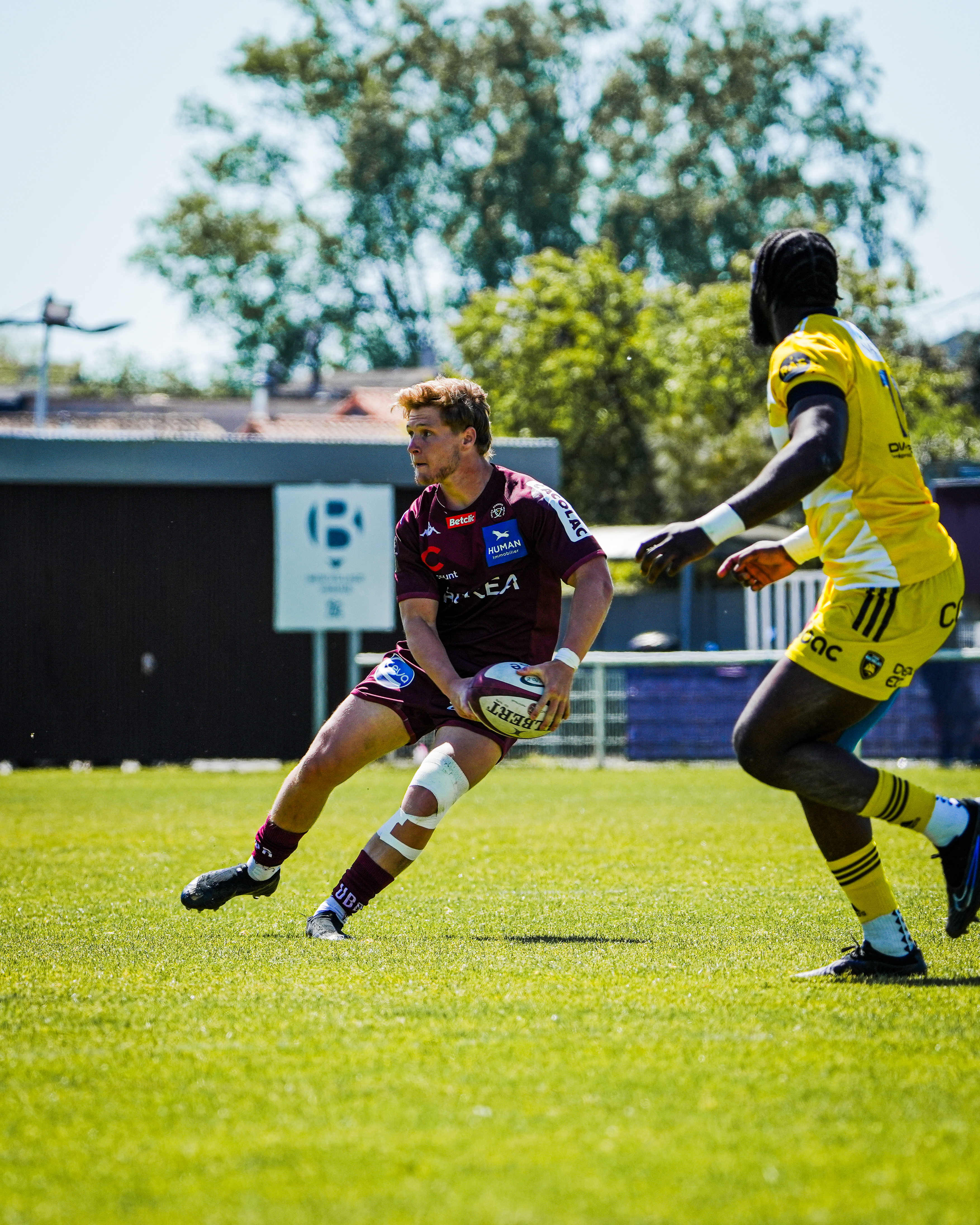 Enfin, après plusieurs attaques infructueuses, Matéo Lavasele parvenait à casser un plaquage puis louvoyait dans la défense rochelaise pour marquer le premier essai de nos Girondins (13' ; 7-7). Par sécurité, Joseph Exshaw choisissait de prendre les poteaux pour prendre le score (22' ; 10-7).