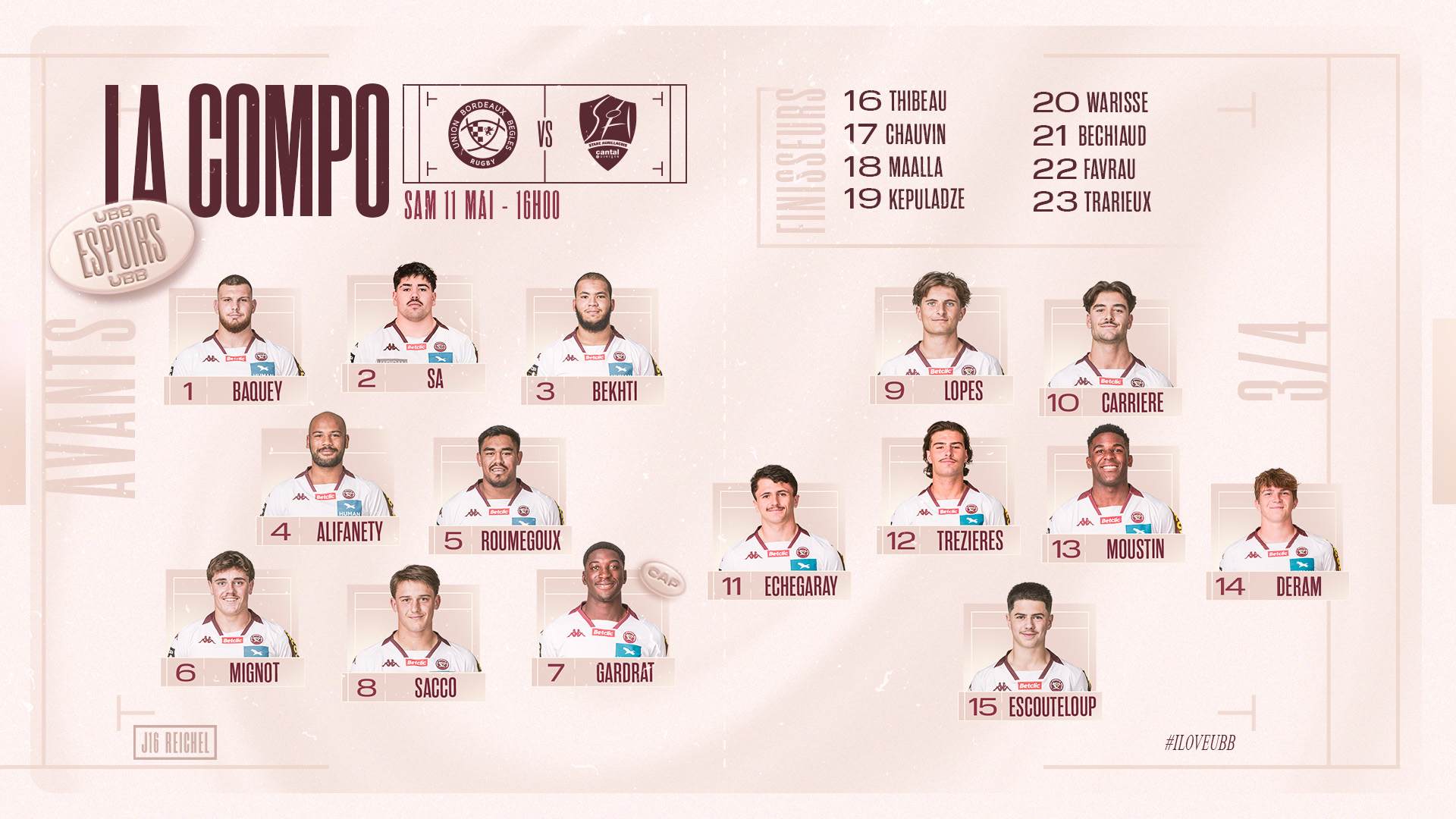 Avant-dernier match de cette saison Reichel ce week-end au CEVA Campus - Stade Moga. Découvrez la composition de l'équipe de nos 23 Espoirs qui affronteront Aurillac pour cette 16e journée ce samedi 11 mai à 16h.