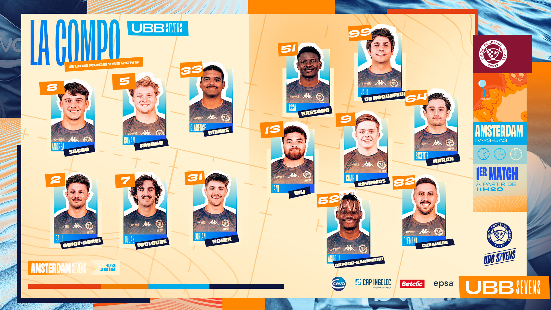 L'équipe se compose de 13 joueurs, dont 4 nouvelles têtes. Le groupe accueil Tani Vili (UBB), un visage familier des feuilles de match des pros de l'UBB, Charlie Reynolds (Saracens), notre premier joueur international de la saison qui rejoint l'UBB Sevens pour ce tournoi, et Ronan Favrau (UBB). Andréa Sacco (UBB) réintègre le groupe cette saison après avoir terminer sa saison à XV.