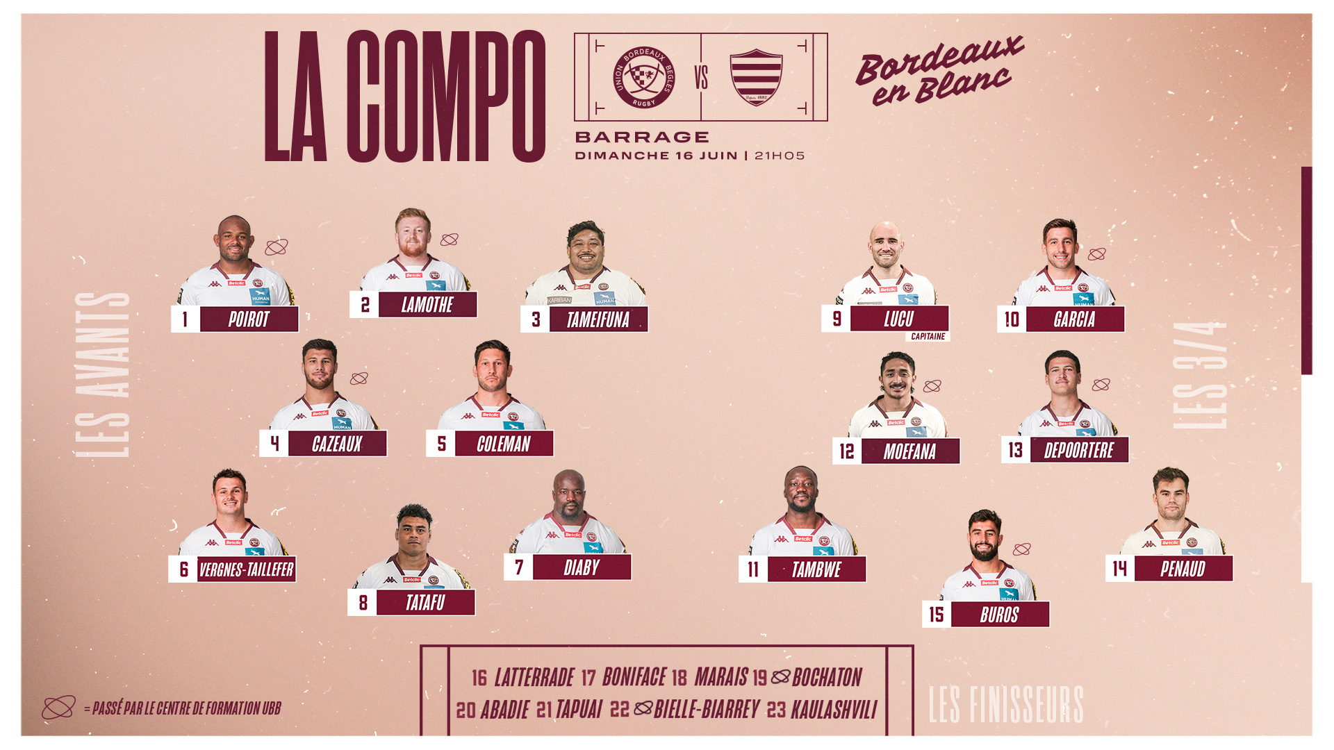 4e phase finale consécutive pour nos girondins qui feront face au Racing 92 ce dimanche en barrage du Top 14, 21h05 à Chaban-Delmas. Découvrez la compo :