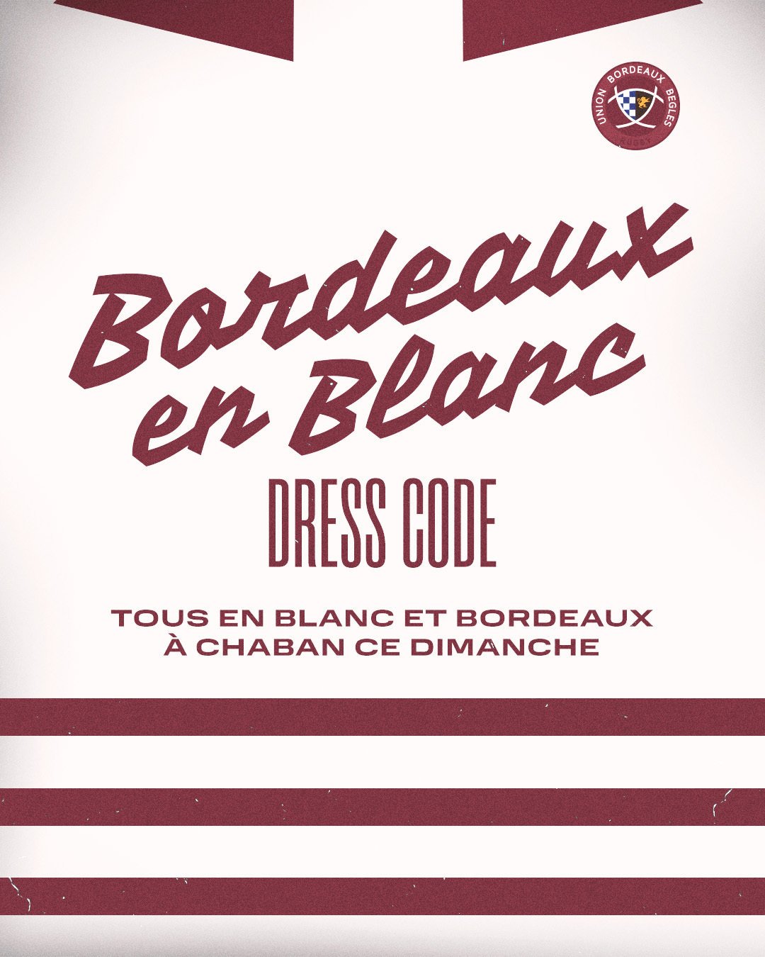 Nous vous prions également, comme lors du match face à Oyonnax, de venir habillés en blanc avec une touche de Bordeaux, pour mettre le stade à nos couleurs.