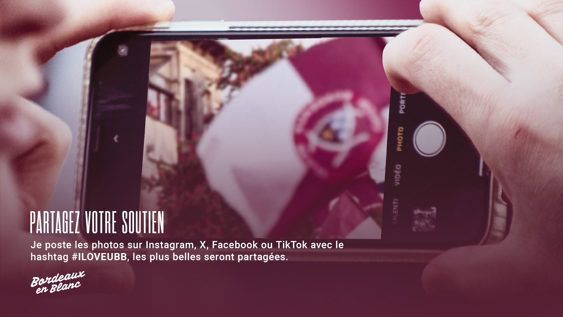Postez vos plus belles photos ou vidéos sur vos réseaux sociaux en taguant @UBBrugby sur Instagram, Facebook ou X et en utilisant le hastag #iloveubb. Nous compilerons vos meilleurs contenus ! Sur Instagram, nos visuels "Bordeaux en Blanc" sont à votre disposition avec la nouvelle fonctionnalité "Ajout perso".
