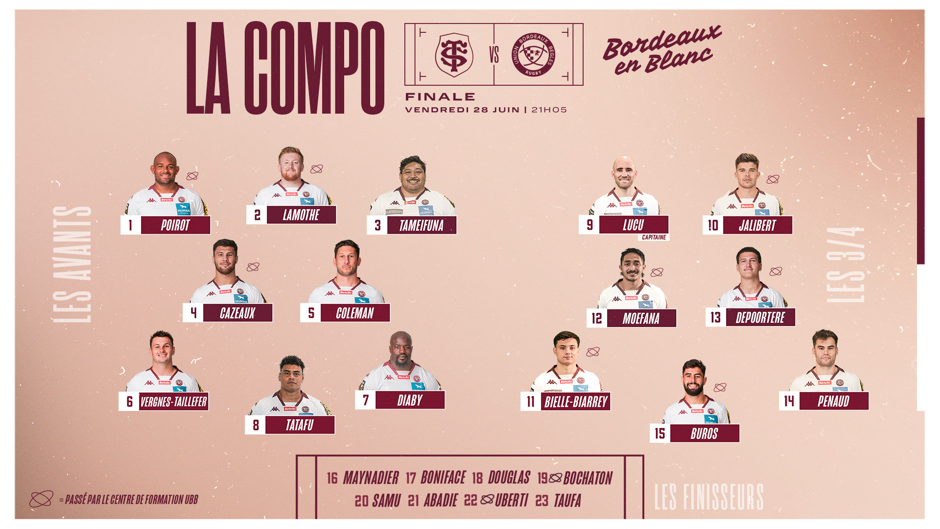 Le dénouement de cette saison 23-24 tire à sa fin. L'UBB affrontera demain le Stade Toulousain en finale du TOP 14, à 21h05, à l'Orange Vélodrome de Marseille. Découvrez la composition de l'équipe alignée par Yannick Bru et son staff sportif :
