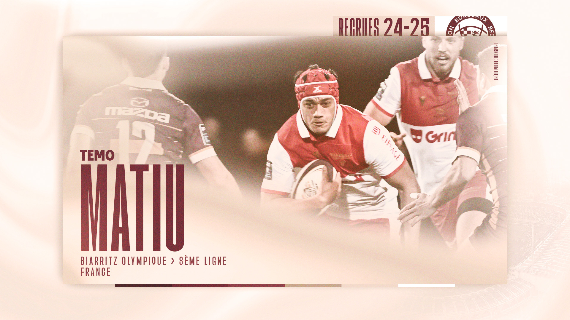 À 22 ans, Temo Matiu nous rejoint en provenance du Biarritz Olympique. Fils de l'ancien deuxième ligne international français Legi Matiu, il est issu d'un parcours atypique qui l'a vu arriver du basket en 2020. Reconnu pour sa vitesse et sa grande capacité d'apprentissage, il arrive en Gironde après avoir été, malgré son jeune âge, l'une des pièces maîtresses du pack biarrot cette saison en PRO D2.