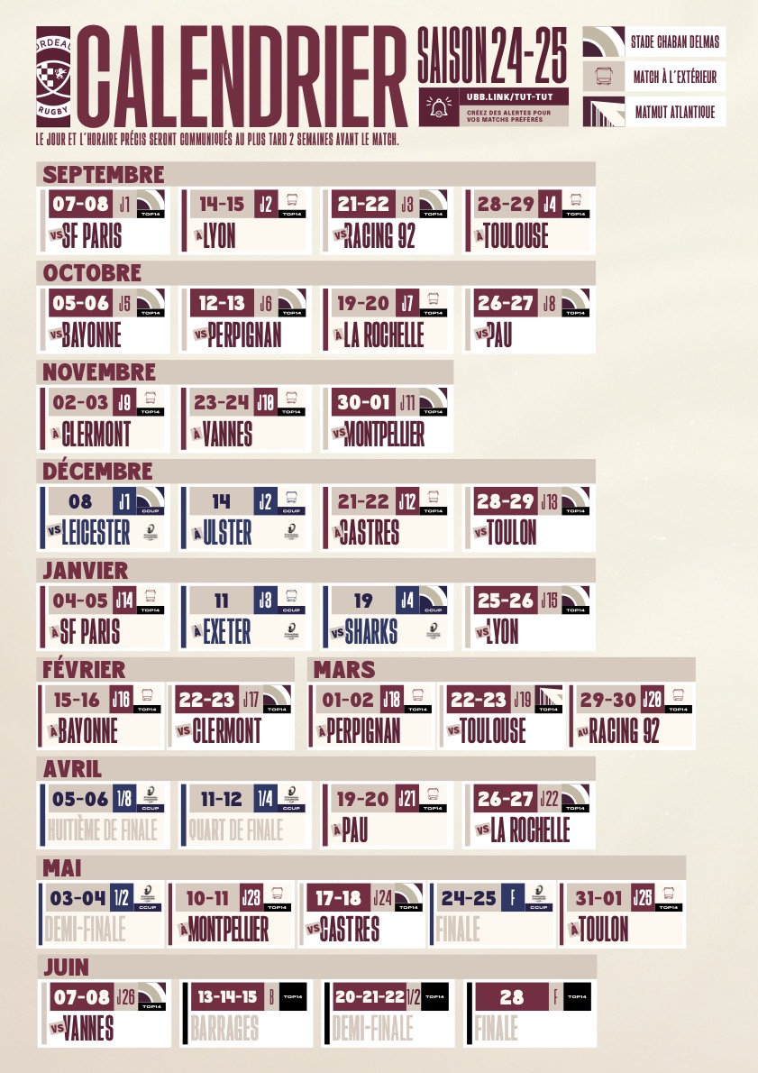Pour rappel, en championnat l'UBB débutera sa saison avec une réception du Stade Français à Chaban, le week-end du 7/8 septembre, avant de se déplacer à Lyon le week-end suivant. En Champions Cup, les Bordeaux & Blancs commenceront également par une réception, celle des Tigers de Leicester le 8 décembre, avant un déplacement en Ulster (Belfast, Irlande du Nord). Pour les deux derniers matchs de poule ils iront à Exeter le 11 janvier, puis accueilleront les Sharks de Durban à Chaban le week-end suivant.