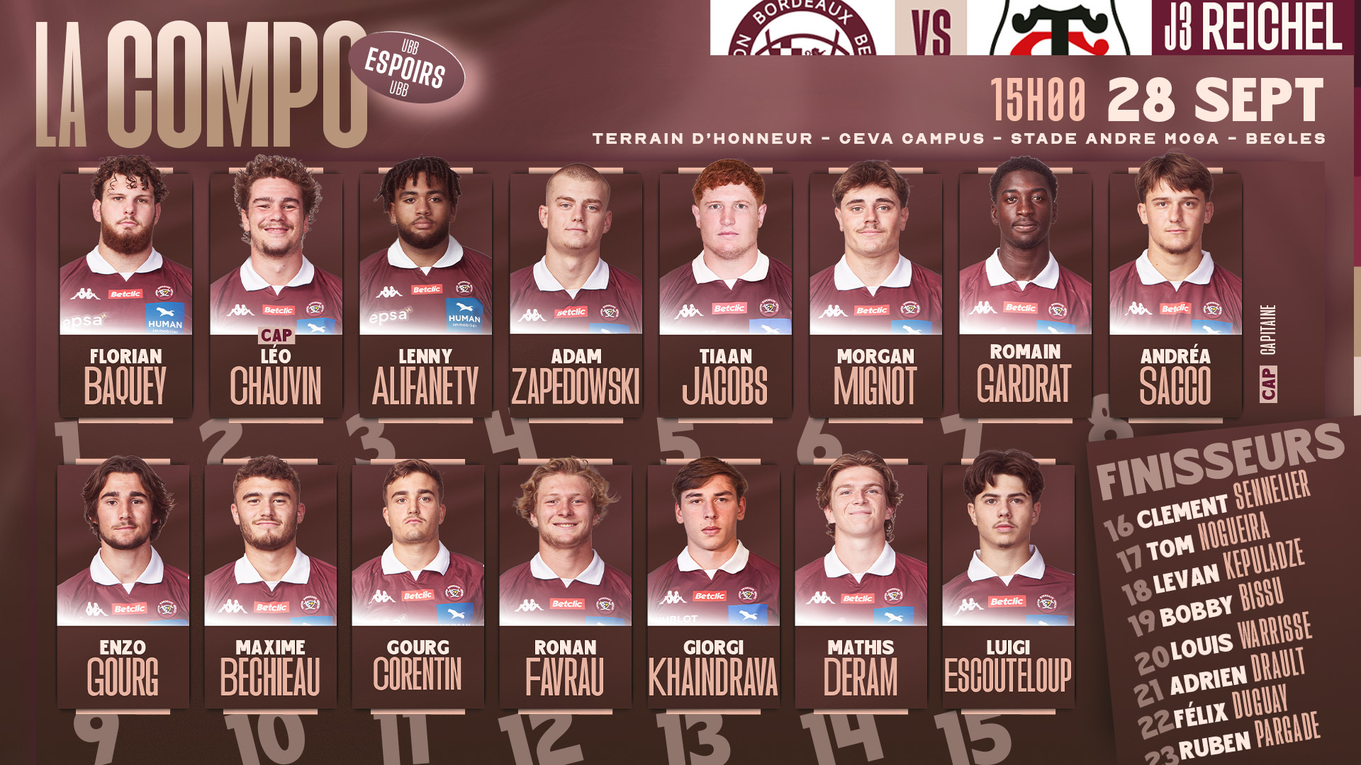 Quelques changements par rapport au week-end dernier : Lenny Alifanety débutera en première ligne, Enzo Gourg retrouve sa place dans le XV titulaire, et Corentin Gourg fera sa première titularisation de la saison à l’aile. De plus, Giorgi Khaindrava portera pour la première fois le maillot Bordeaux & Blanc, tandis que Luigi Escouteloup débutera à l’arrière.