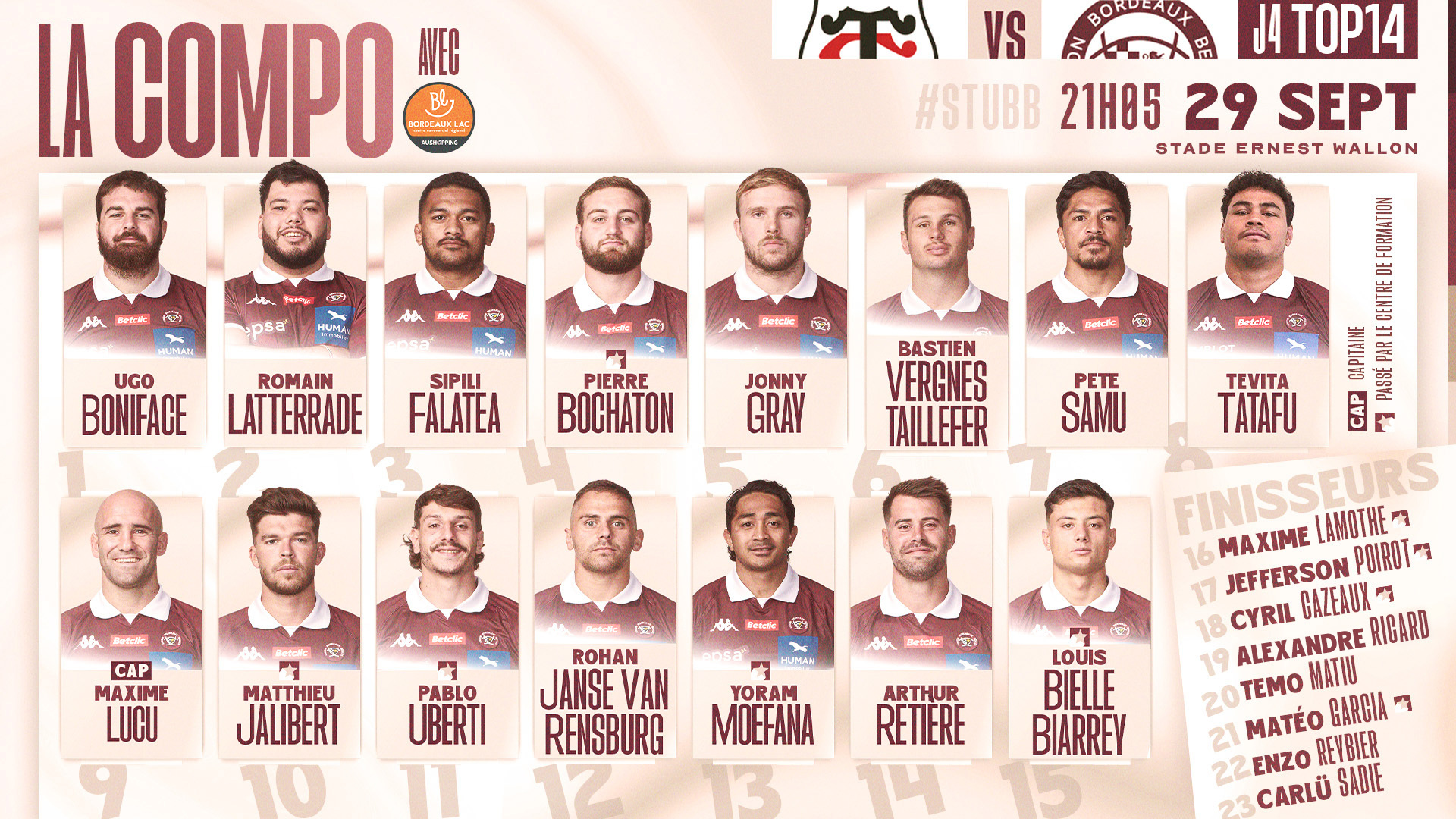 Yannick Bru et son staff sportif ont dévoilé la composition d'équipe des 23 Bordeaux & Blanc qui se déplaceront à Toulouse, dimanche 29 septembre à 21h05, pour le compte de la 4e journée de TOP 14 :