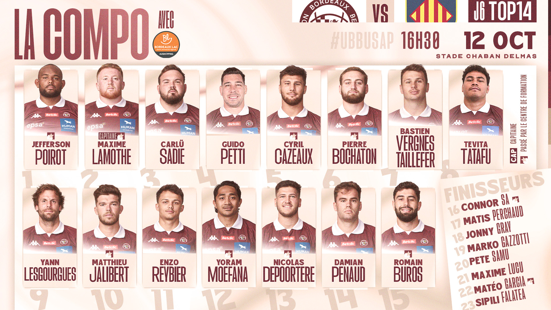 Deuxième match à domicile d'affilé pour nos girondins qui reçoivent les perpignanais pour le compte de cette 6e journée de TOP 14, ce samedi 12 octobre à 16h30. Découvrez les 23 girondins qui affronteront les catalans demain :