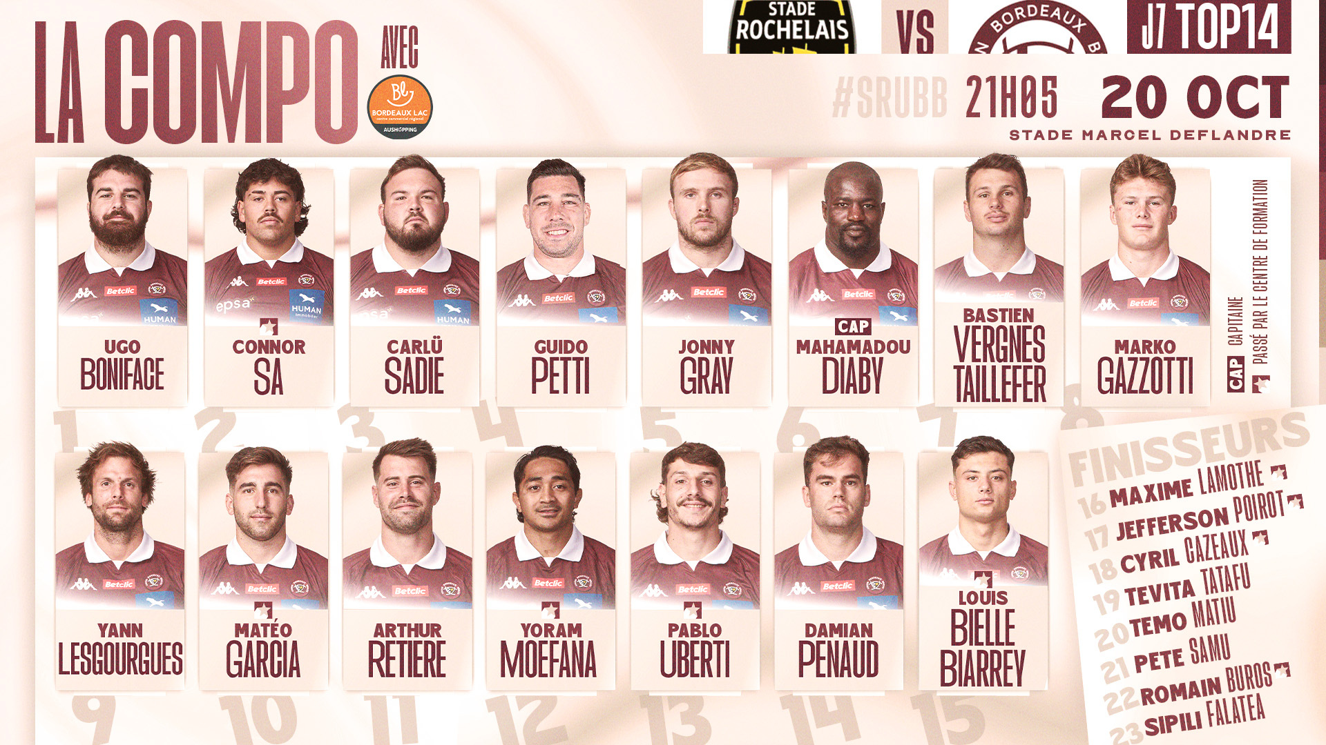 Après deux matchs à domicile, nos Girondins se déplacent en Charente-Maritime pour affronter le Stade Rochelais dans le cadre de la 7e journée du TOP 14. Voici la composition de l'équipe :