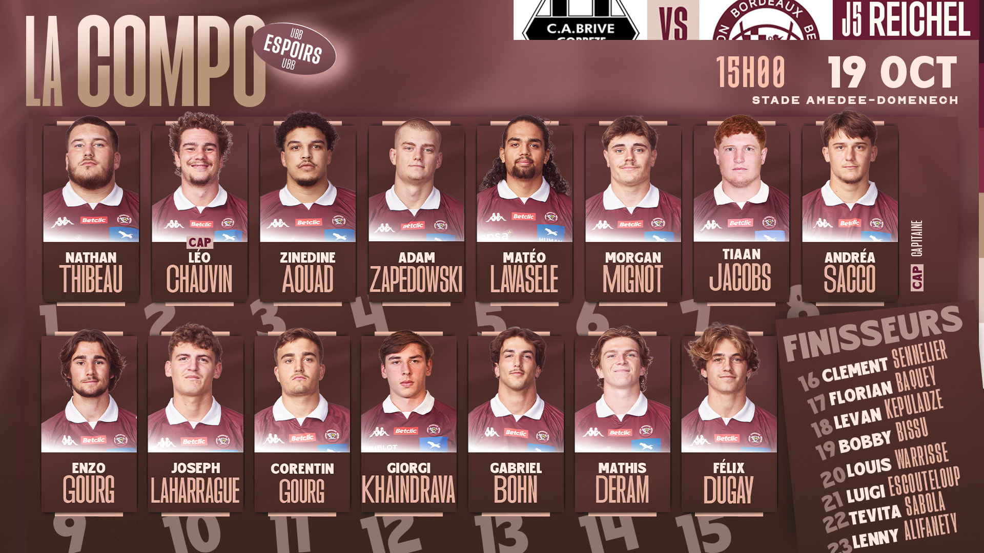 Quelques changements sont à noter dans la composition. Il y a du mouvement en première ligne ! Cette fois-ci, notre capitaine Léo Chauvin sera accompagné de Nathan Thibeau et Zinedine Aouad. Matéo Lavasele prend place en deuxième ligne et Tiaan Jacobs fait son retour avec les Espoirs.
