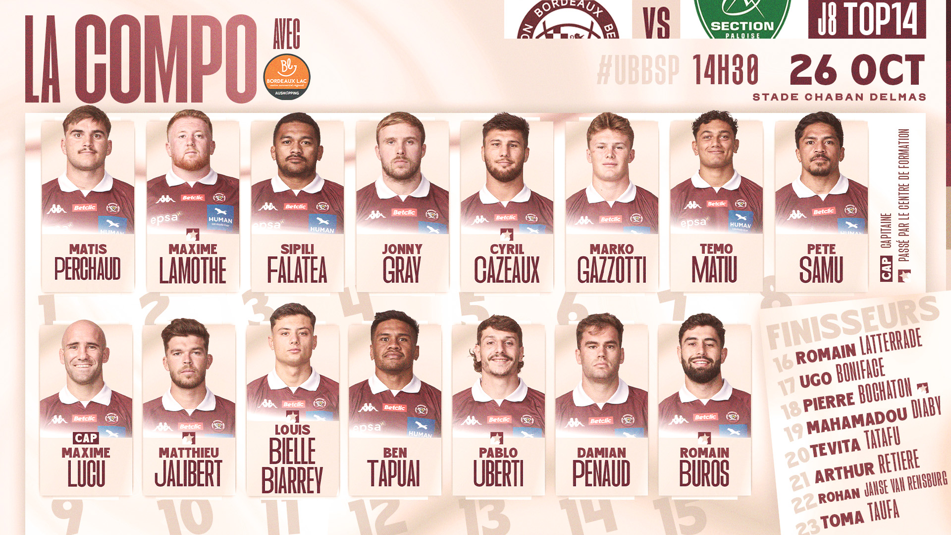 5e journée à Chaban et 5e guichets fermés pour cette rencontre face à la Section Paloise Béarn Pyrénées ! Demain, à 14h30, nos Girondins joueront leur 8e rencontre de TOP 14. Voici la composition de l'équipe :