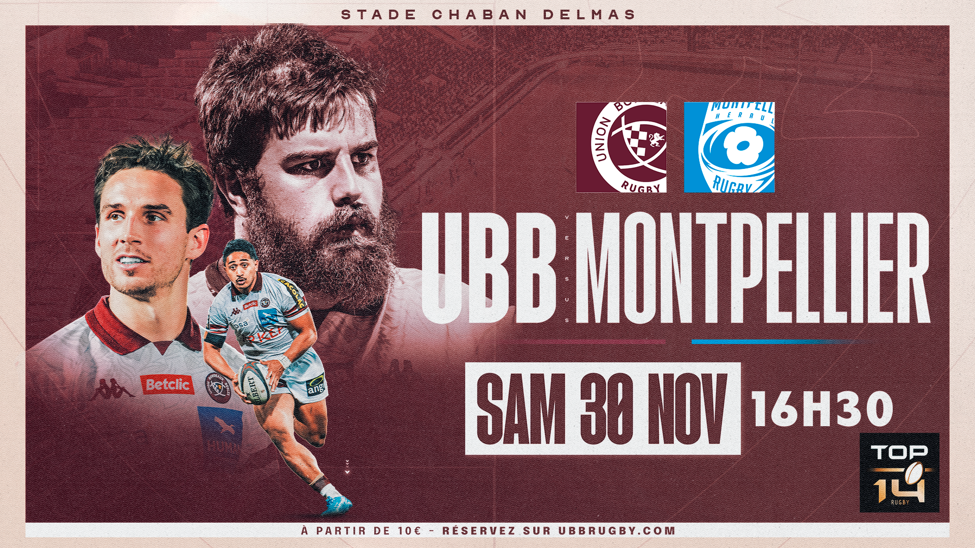 La billetterie face à Montpellier est ouverte ! Ne ratez pas le retour à Chaban le samedi 30 novembre prochain à 16h30 au Stade Chaban Delmas, pour la 11e journée de TOP 14.