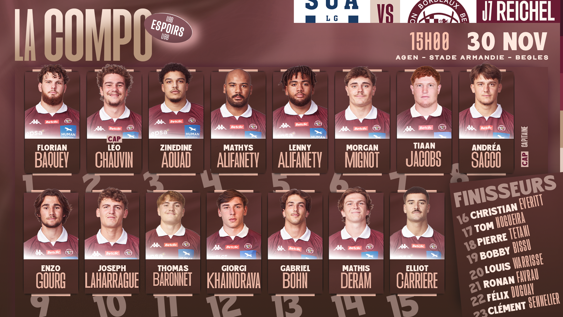 Reprise du championnat Reichel ! Après quatre semaines sans compétition, nos jeunes pousses se rendront à Agen pour affronter le SU Agen dans le cadre de la 7e journée de la saison 2024-2025. Le match se jouera à 15h au stade Armandie. Découvrez la composition de notre équipe :