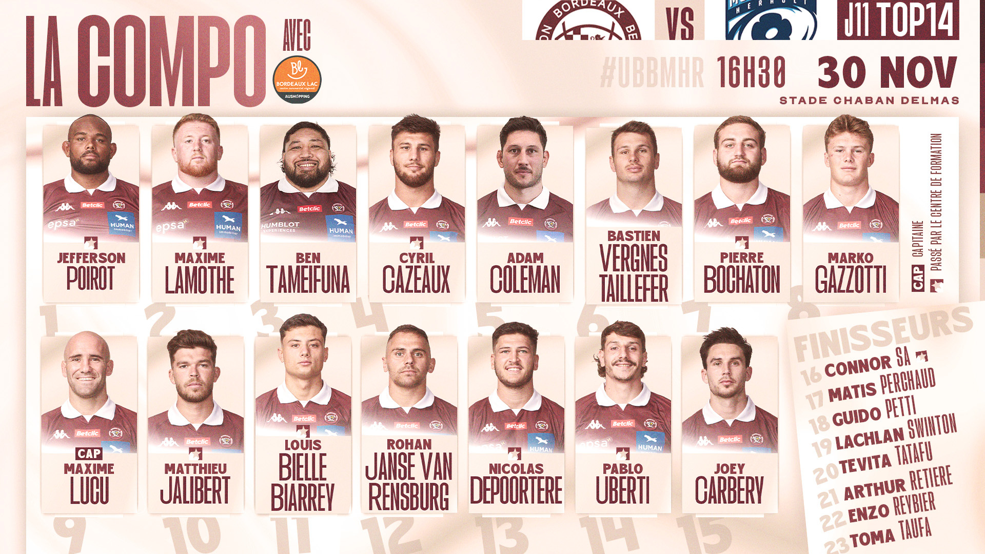 En première ligne Maxime Lamothe et Ben Tameifuna font leur retour dans le XV de départ en compagnie de Jeff Poirot. Pour ce qui sera le premier match de notre pilier tongien avec l'UBB cette saison. Du côté de la seconde ligne, Adam Coleman et Cyril Cazeaux sont reconduits, alors qu'en 3e ligne le turnover est total puisque Bastien Vergnes-Taillefer, Pierre Bochaton et Marko Gazzotti remplacent Diaby, Matiu et Samu.
