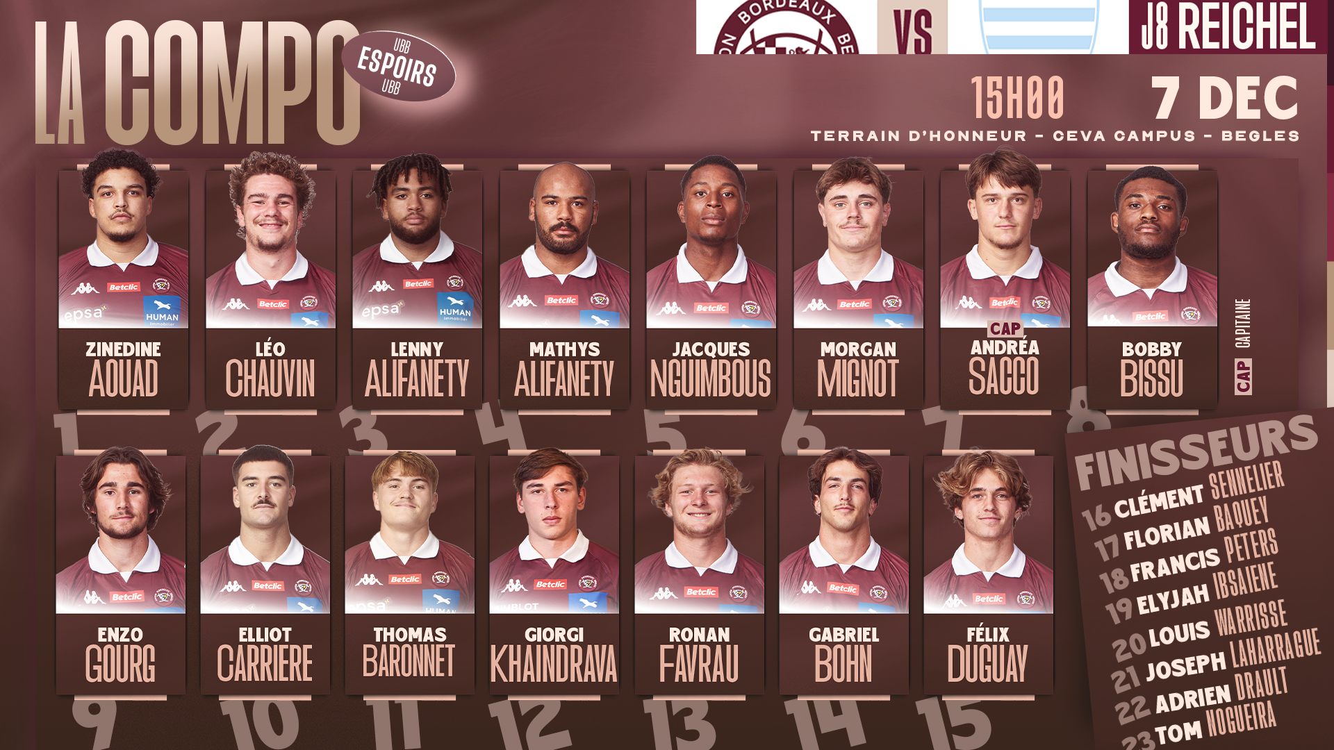 Pour cette 8e journée du championnat Reichel, nos Espoirs recevront le Racing 92 au CEVA Campus, stade Moga. Le coup d’envoi de la rencontre sera donné ce samedi 7 décembre à 15h. Découvrez la composition de leur équipe :
