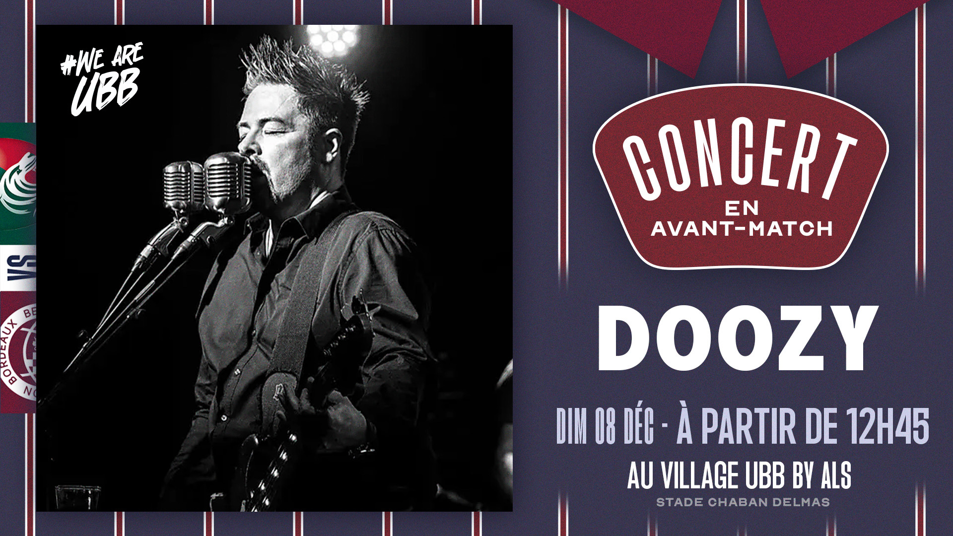 Retrouvez le groupe Doozy en concert au Village UBB by ALS dès 12h45 ! Pour ne rien manquer du spectacle, entrez dans le stade dès l'ouverture des portes à 12h30.