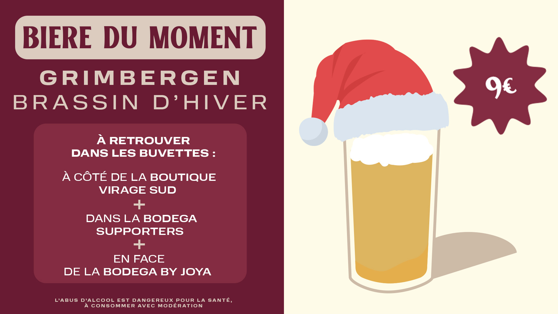 Découvrez également notre "Bière de Noel" : la Grimbergen Brassin d'Hiver, qui fera son arrivée pour cette rencontre à retrouver uniquement dans certaines de nos buvettes (voir ci-dessous).