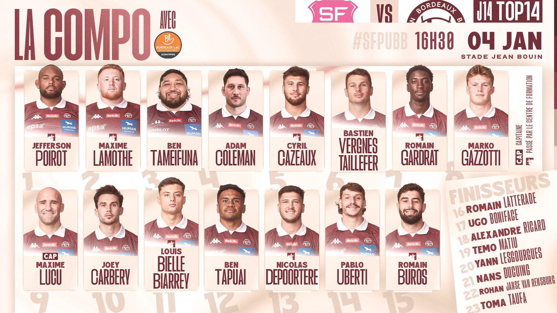 Premier déplacement de l'année 2025 pour nos Bordeaux & Blanc, qui affrontent le Stade Français Paris au stade Jean-Bouin lors de cette 14e journée de TOP 14.