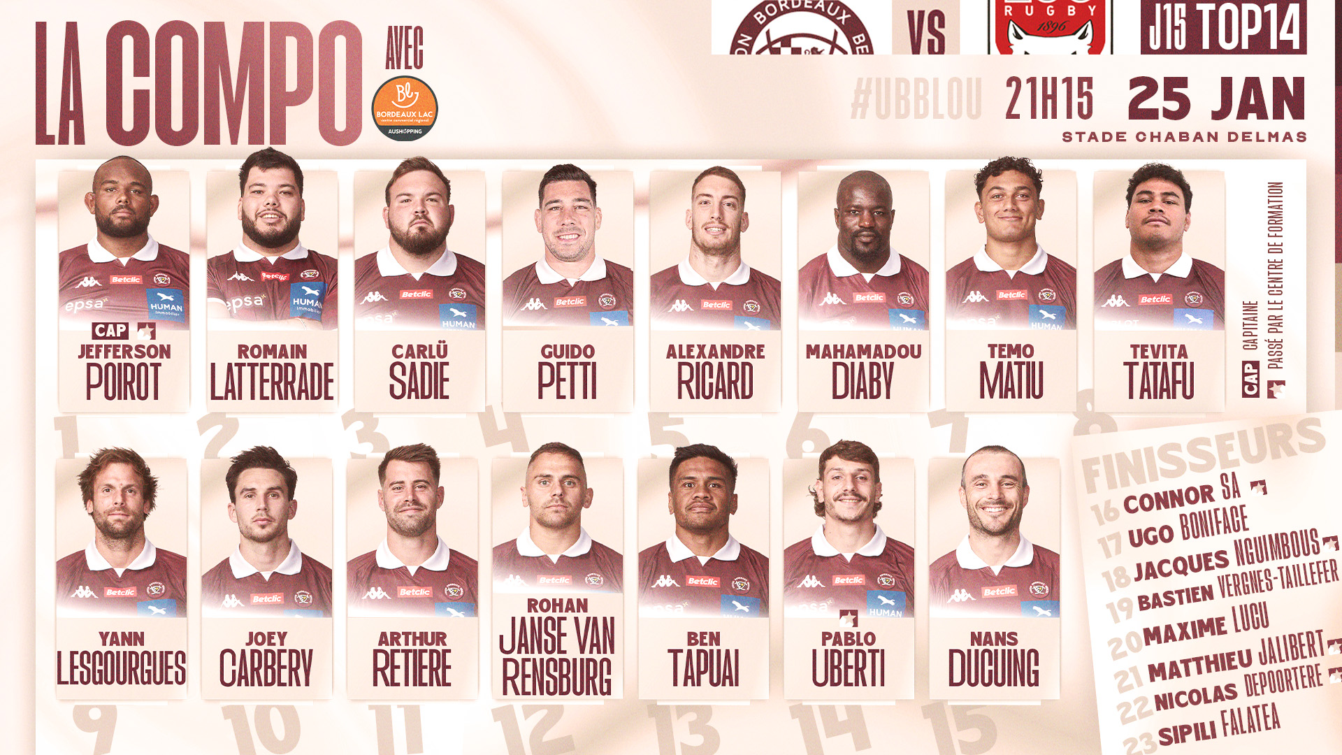 Retour du TOP 14 à Chaban avec la réception du LOU ce samedi 25 janvier à 21h15 ! Le match sera diffusé sur C8. Découvrez la composition :