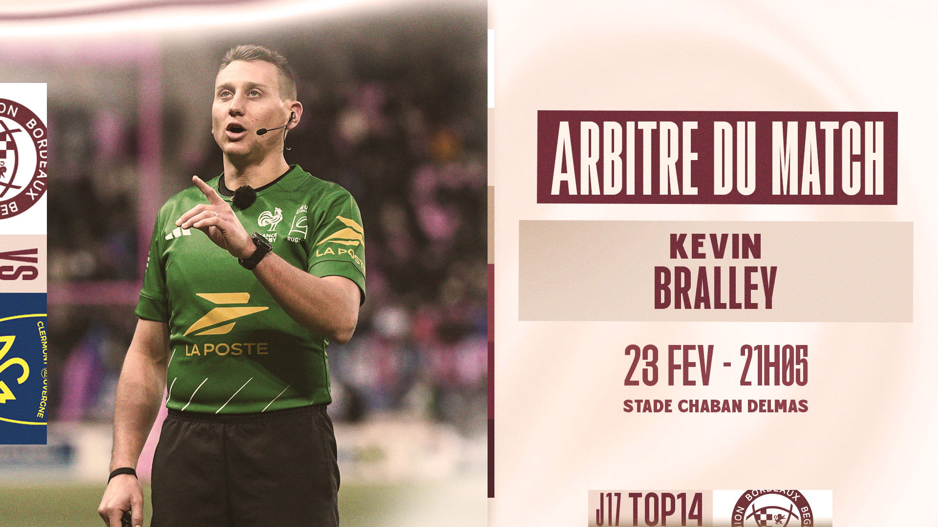 Réception de l'ASM Clermont pour cette 17e journée de TOP 14. Voici le corps arbitral pour cette rencontre :
