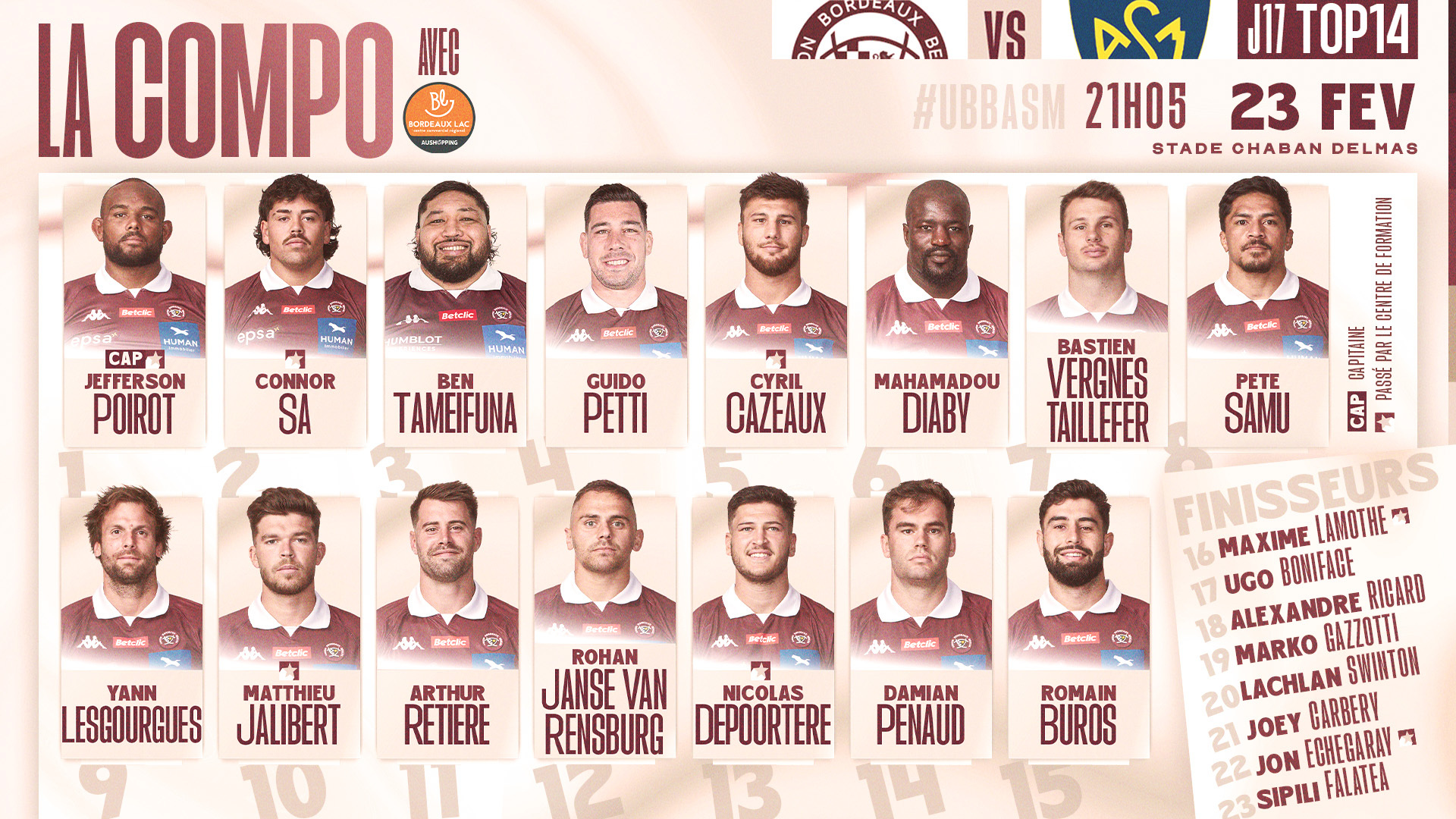 Chaban retrouve ses joueurs pour cette 17e journée de TOP 14 face à l'ASM Clermont, à 21h05 ce dimanche 23 février. Découvrez la composition :