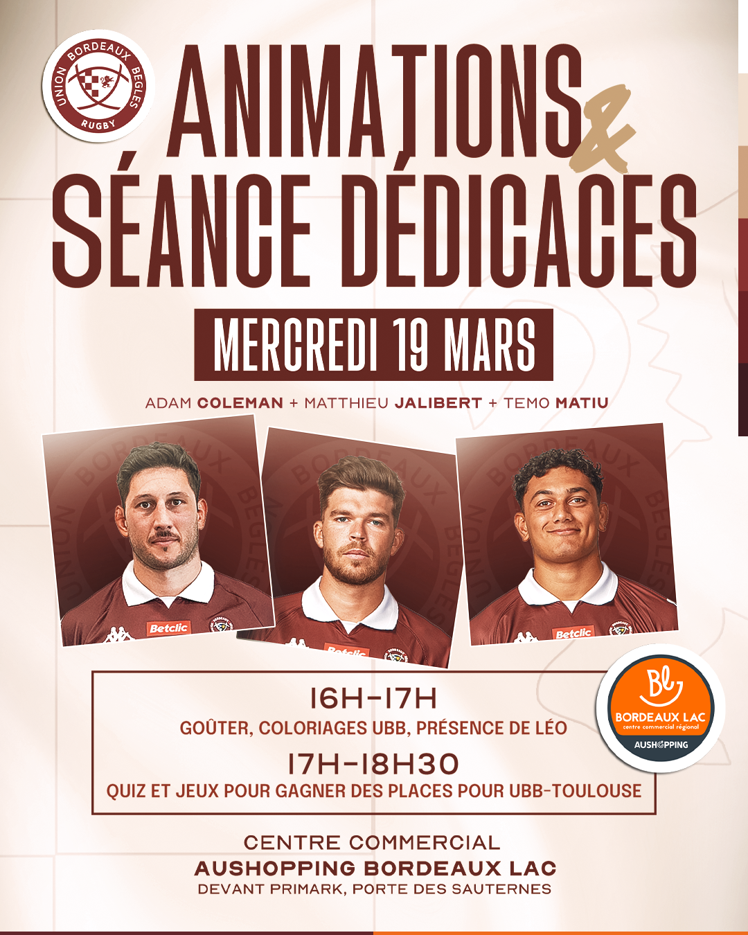 Le Centre Commercial Aushopping de Bordeaux Lac organise, en collaboration avec le club de l'UBB, une séance de dédicaces le mercredi 19 mars prochain en compagnie de Matthieu Jalibert, Temo Matiu et Adam Coleman, de 17h à 18h30.