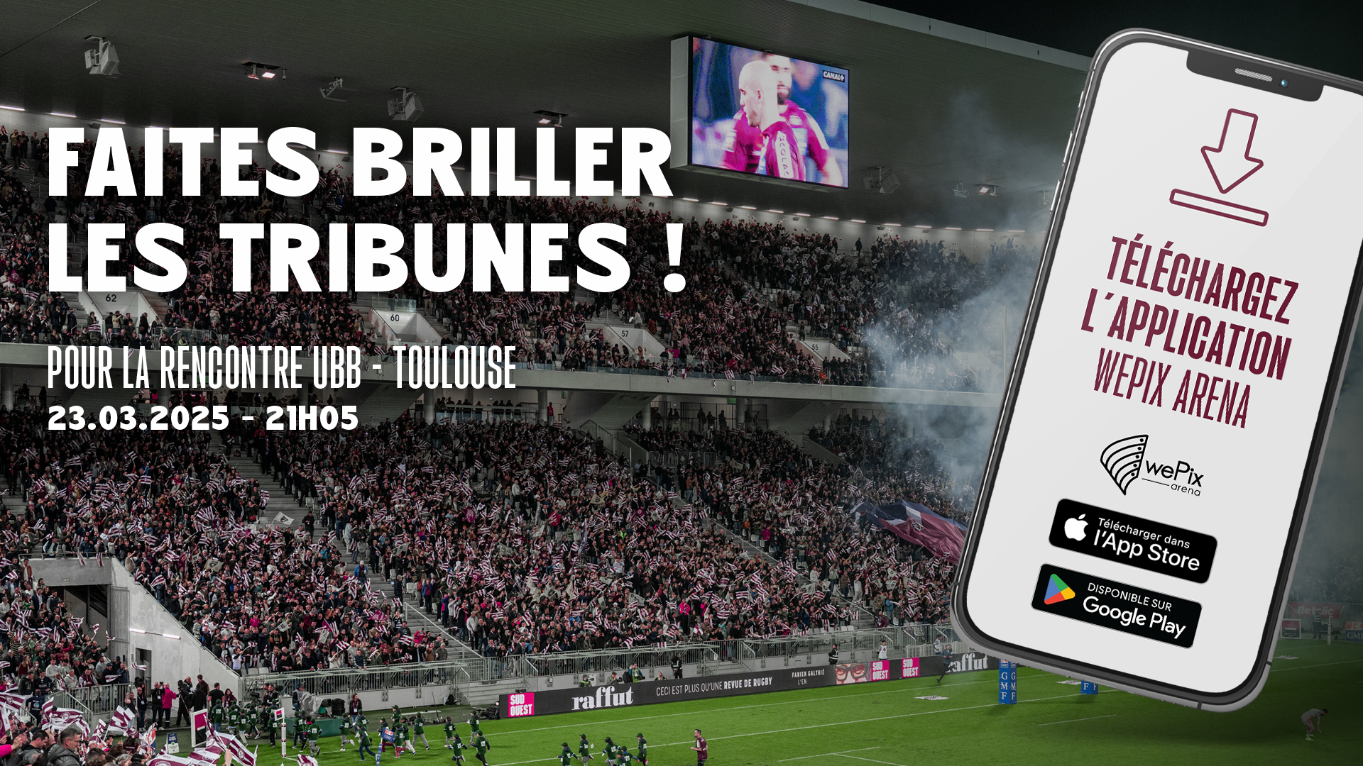 Vous avez été nombreux à participer aux deux premières éditions pour la réception de Toulon puis de Lyon, venez nous aider à faire briller le Matmut Atlantique avec WePix Arena ! Téléchargez l'application WePix Arena et sélectionnez l'évènement UBB / Toulouse. Un spectacle lumineux exclusif se lancera avant le coup d'envoi du match !