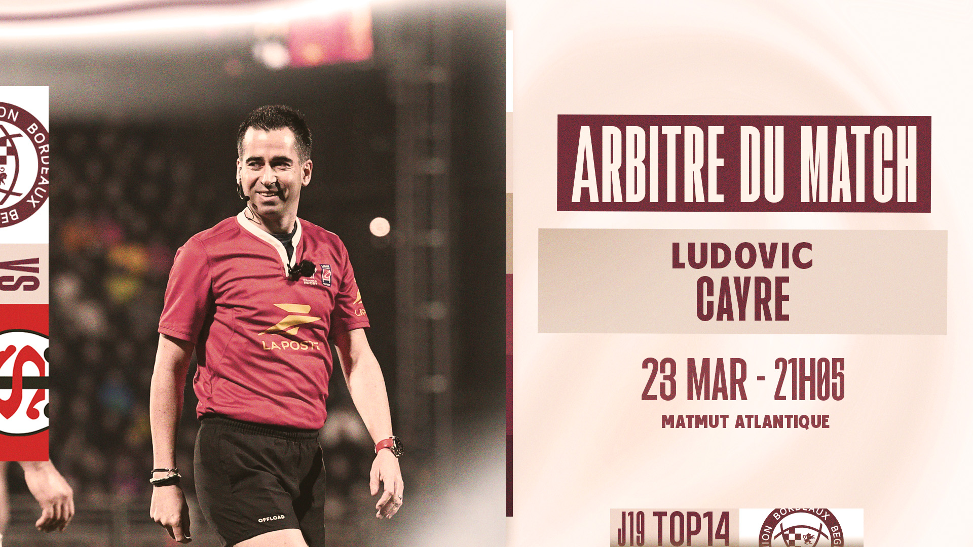 L'UBB jouera cette 19e journée de TOP 14 au Matmut Atlantique. Voici le corps arbitral pour cette rencontre :