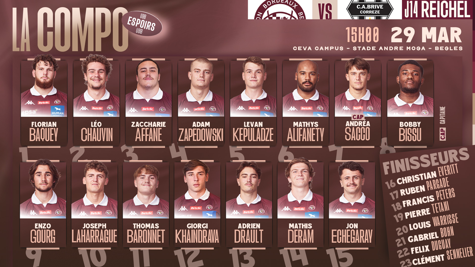 Voici la composition de l'équipe : Seuls deux changements sont à noter dans la composition de nos Espoirs : Adrien Drault intègre le XV titulaire, et Jon Echegaray fait son retour dans le groupe.