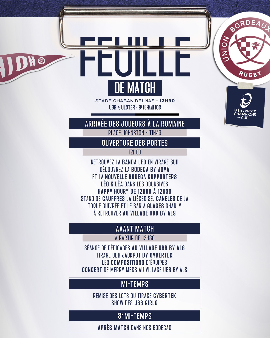 Pour ce match décisif l'UBB affrontera les ulstermen à 13h30. En raison de la forte affluence attendue et de l'horaire de la rencontre, plus que jamais anticipez votre arrivée au stade !