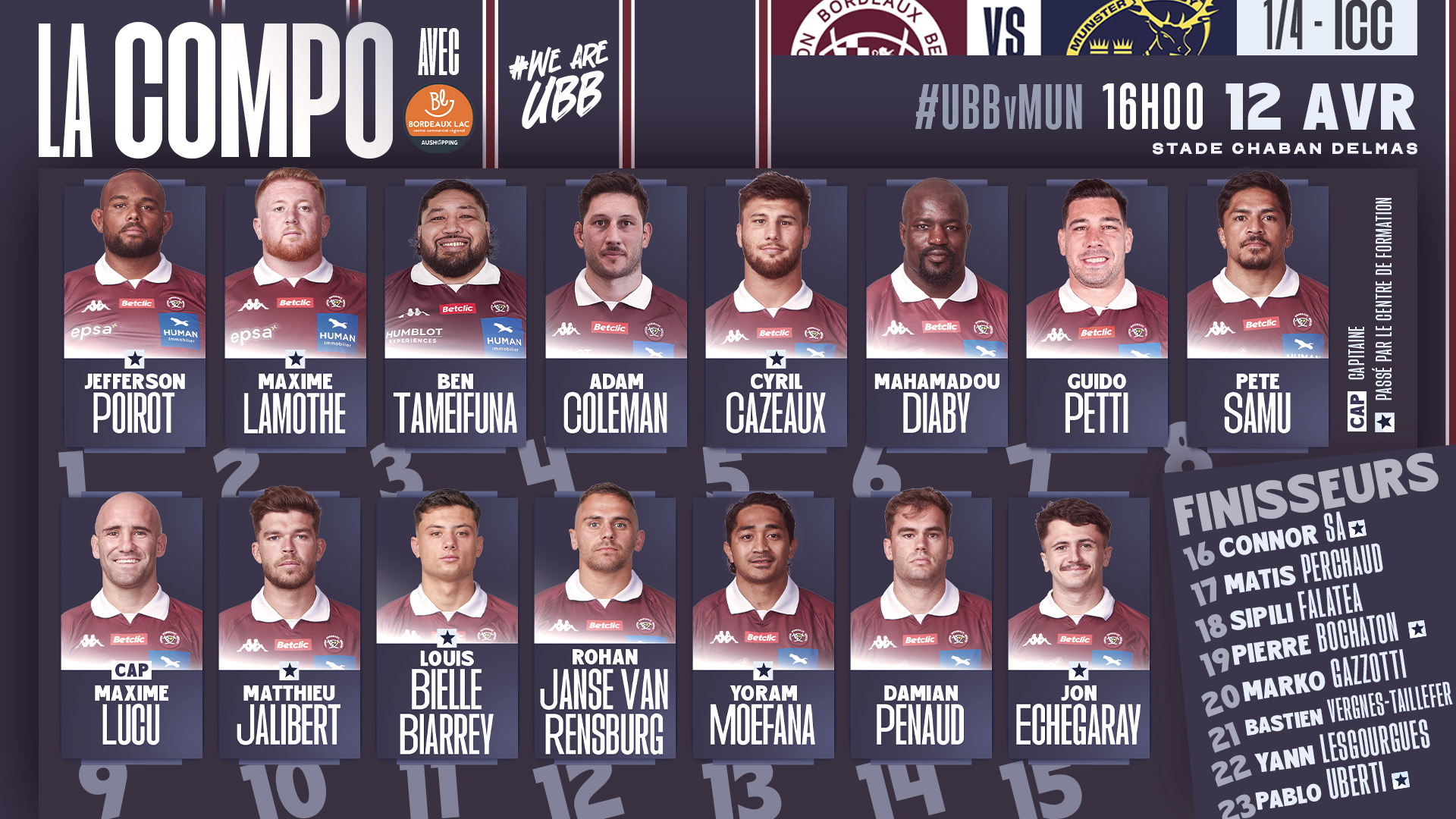 L'UBB rencontrera pour la première fois de son histoire le Munster, dans le cadre du quart de finale de l'Investec Champions Cup, ce samedi 12 avril à 16h. Découvrez la compo !