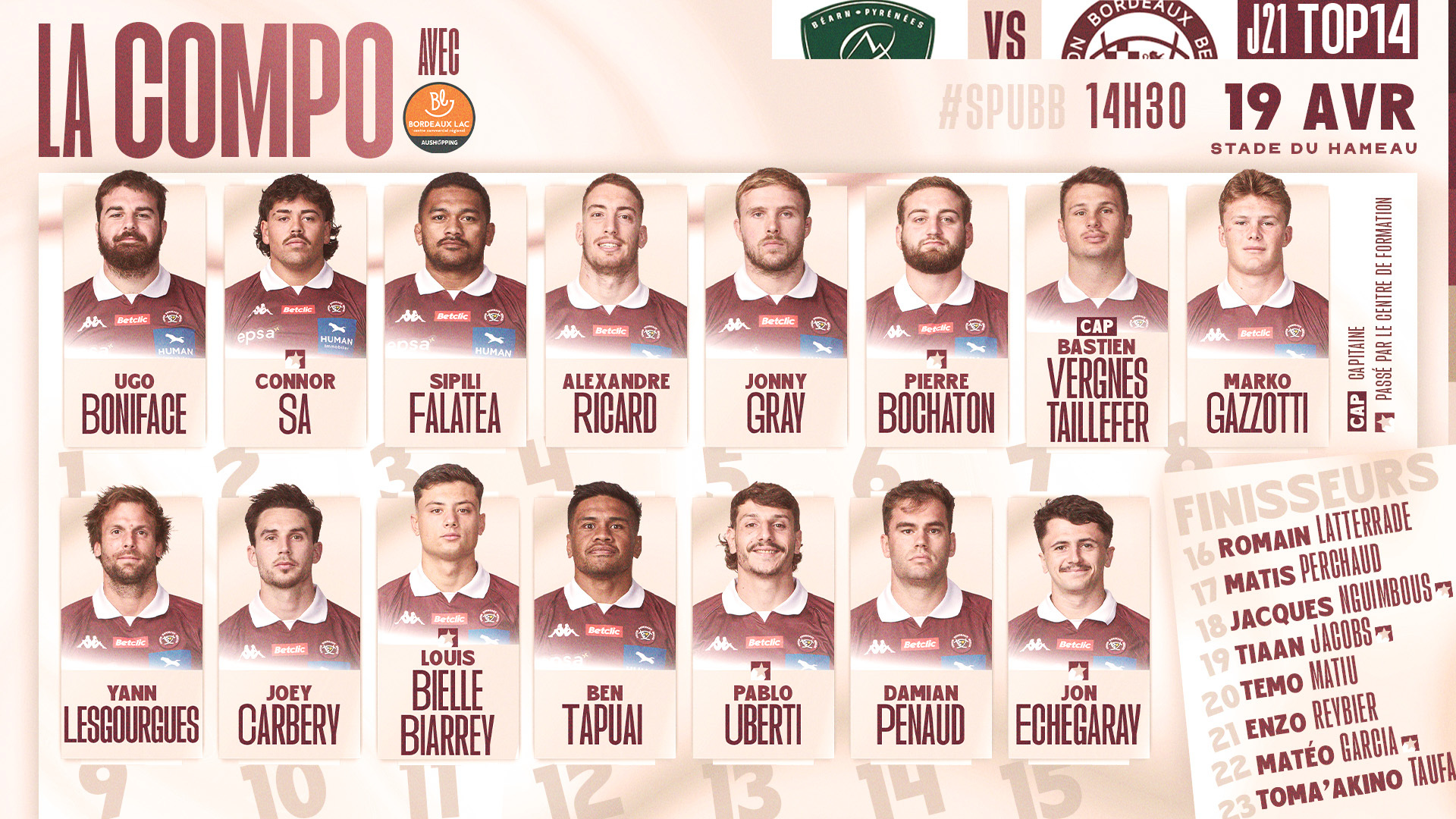 L'UBB retrouve le Top 14 ce week-end, dans le cadre de la 21e journée, avec un déplacement à Pau ce samedi 19 avril à 14h30. Découvrez la compo !