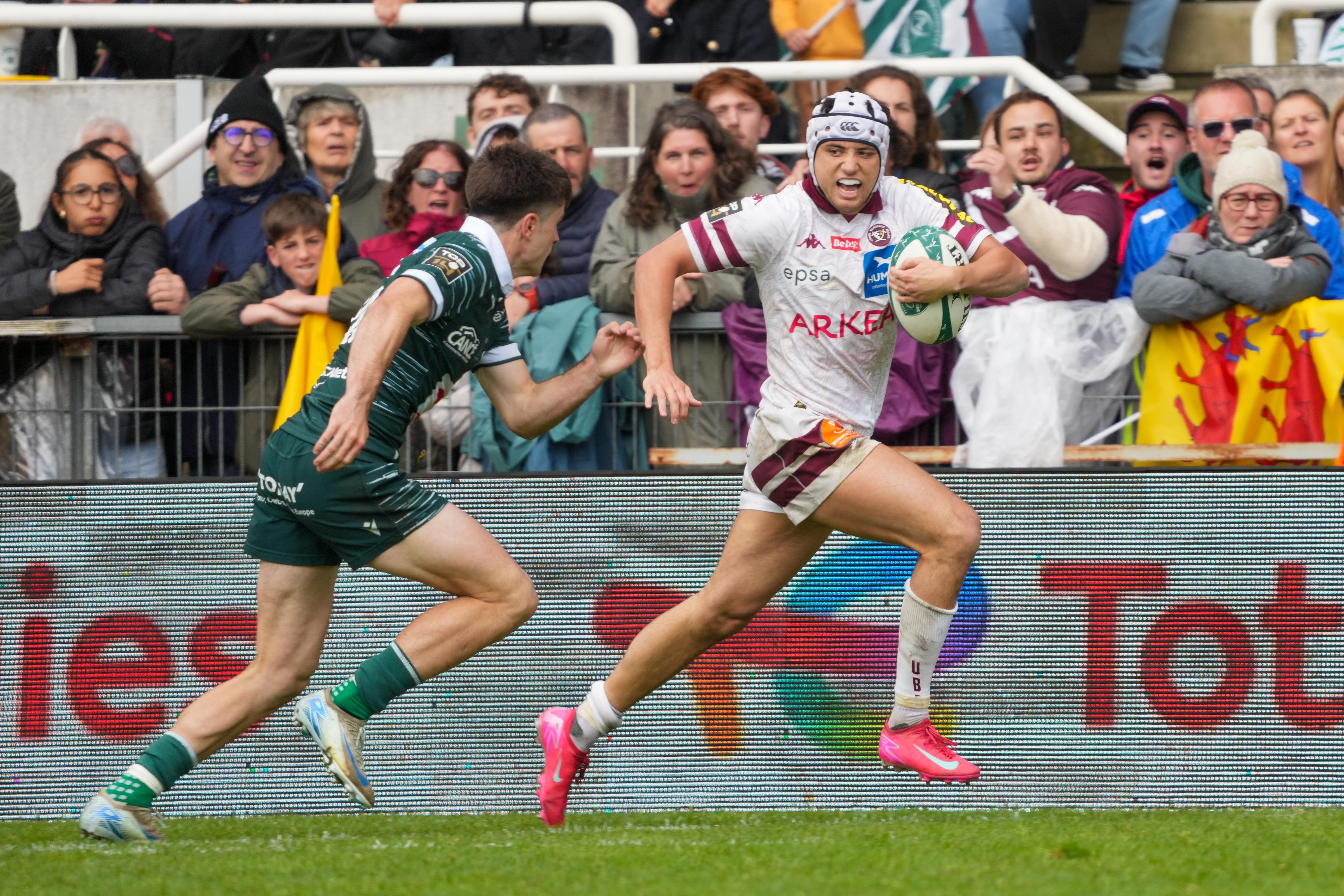 Les palois continuaient ensuite de mettre la pression aux girondins et Brau-Boirie trouvait même la faille suite à un ballon porté bien amené par ses avants (66e). L'essai était finalement refusé en raison d'un en-avant et nos girondins pouvaient souffler après cet avertissement sans frais. D'autant plus que deux minutes plus tard, sur un ballon récupéré dans leurs 22m, ils allaient renverser le cours du match. Après une longue passe vers l'extérieur de DAMIAN PENAUD, Pablo Uberti trouvait LBB sur l'aile, Louis accélèrait et retrouvait son coéquipier à l'intérieur qui donnait ensuite à Matéo Garcia. Ce dernier servait à nouveau LBB qui déposait tout le monde pour marquer après une action de 80m ! Joey Carbery transformait à nouveau et l'Union reprenait les commandes du match (22-23 ; 69e).