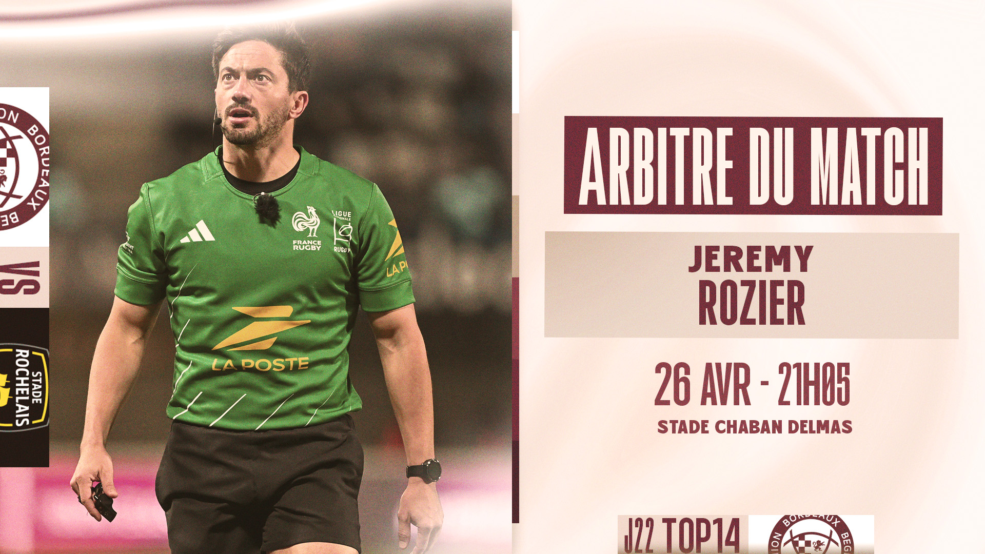 Jérémy Rozier dirigera cette rencontre face à La Rochelle. Il sera assisté de S. Coulon et S. Crapoix sur les touches ainsi que de C. Marchat à la vidéo.