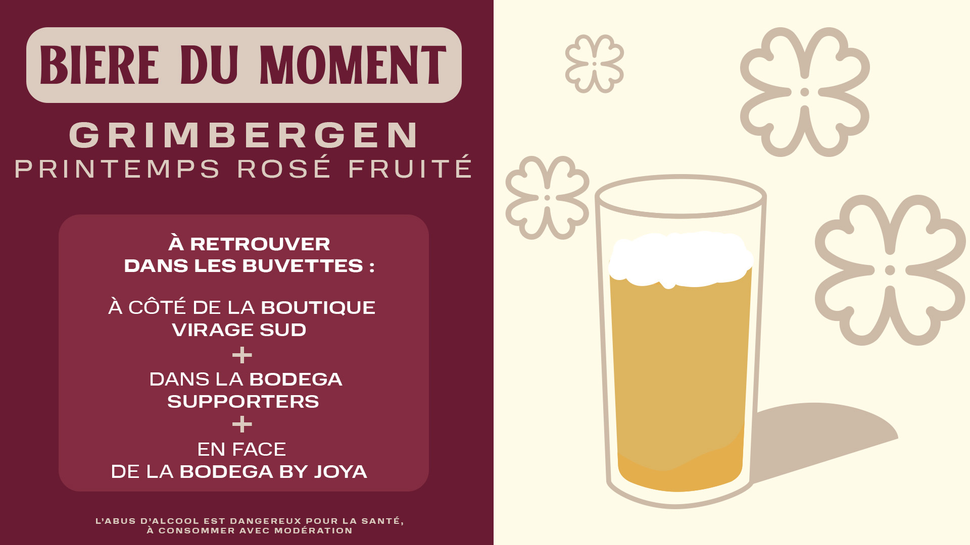 Notre nouvelle Bière du moment Grimbergen Printemps rosé fruité sera elle disponible dans nos buvettes : Boutique virage sud, Bodega supporter et en face de la Bodega by Joya.
