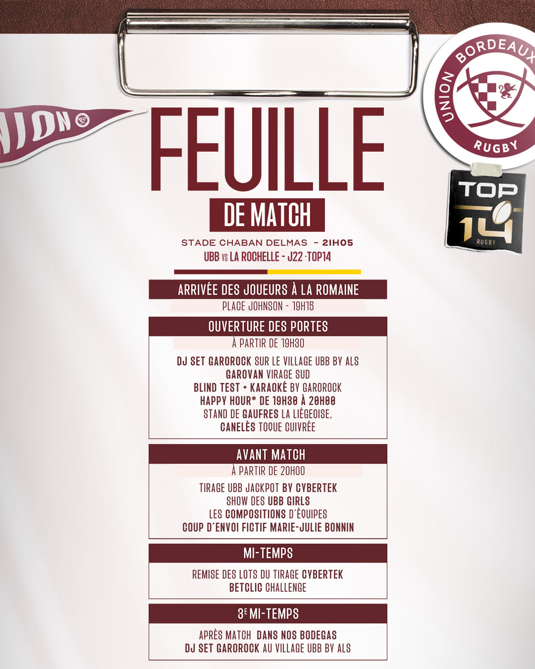Le bus de l'UBB déposera les joueurs Place Johnston autour de 19h15, pour qu'ils parcourent les derniers mètres au plus proche de vous, avec speaker et DJ à partir de 19h00. Venez partager ce moment privilégié !