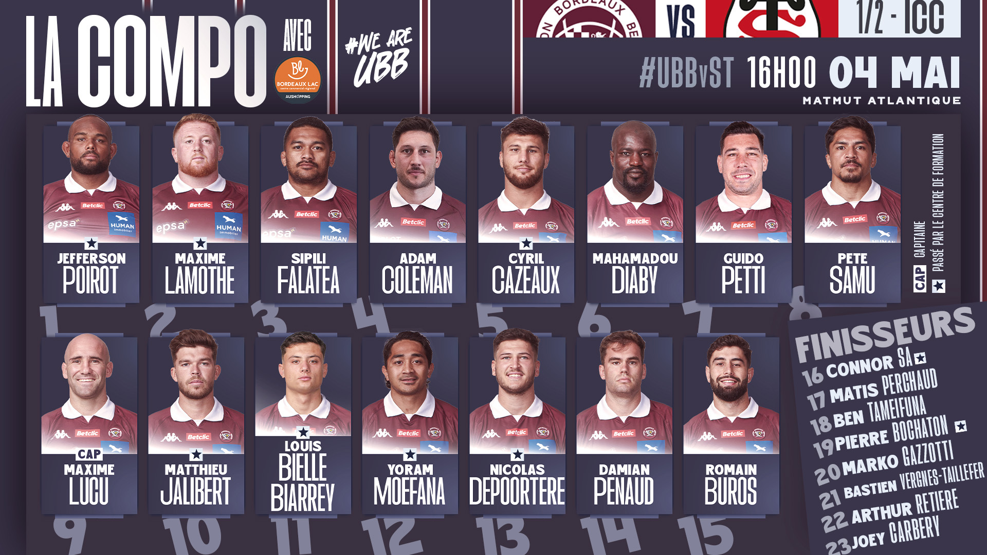 La phase finale d'Investec Champions Cup se poursuit pour nos joueurs avec cette demi-finale et un choc face au Stade Toulousain, ce dimanche 4 mai à 16h. Rendez-vous tous en Bleu au Matmut Atlantique pour soutenir nos Girondins. Découvrez la compo pour cette rencontre !