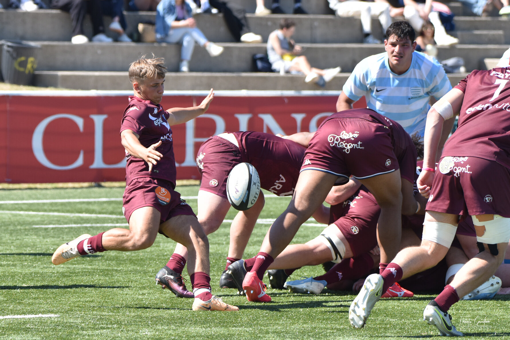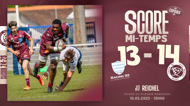 Début de second acte à l'avantage des franciliens qui mettaient nos jeunes sous pression. Les bordelo-béglais, solidaires en défense, contenaient les assauts ciel et blancs mais finissaient par craquer (48') avec un essai du capitaine Jassem Saghri qui s'échappaient pour aplatir en coin (18-14).