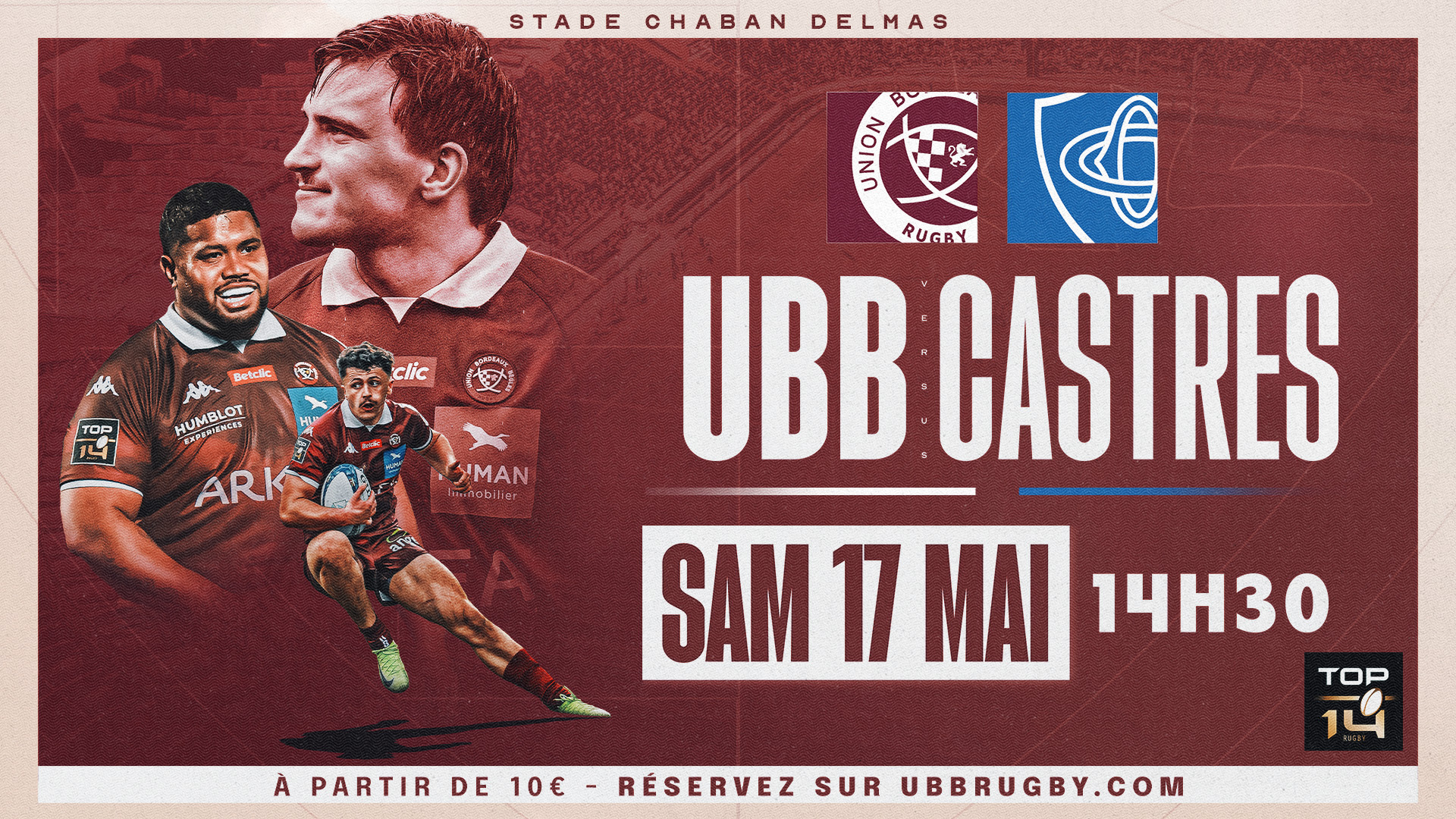 Pour ce match décisif dans la course au Top 2 l'UBB affrontera les tarnais à 14h30. En raison de la forte affluence attendue et de l'horaire de la rencontre, pensez à anticiper votre arrivée au stade !